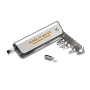 Multi-tool holder and LED torch in ABS casing with metallic finish. Includes 6 different interchangeable screwdriver heads. 3 cell batteries included.