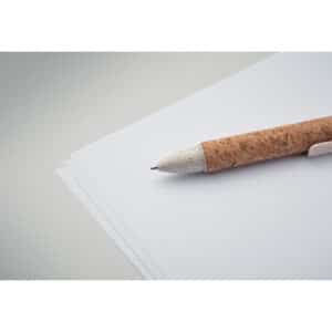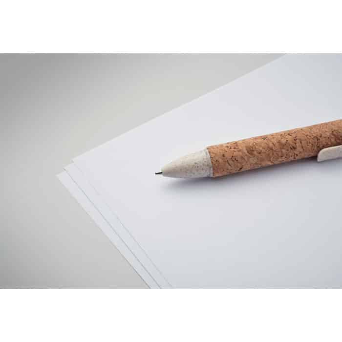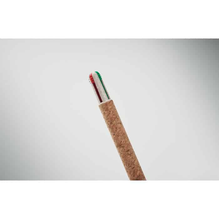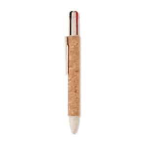 Push button 4-colour ink ball pen with cork barrel and wheat straw (50%) and ABS plastic (50%) fittings.