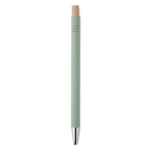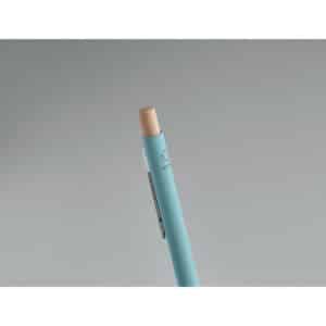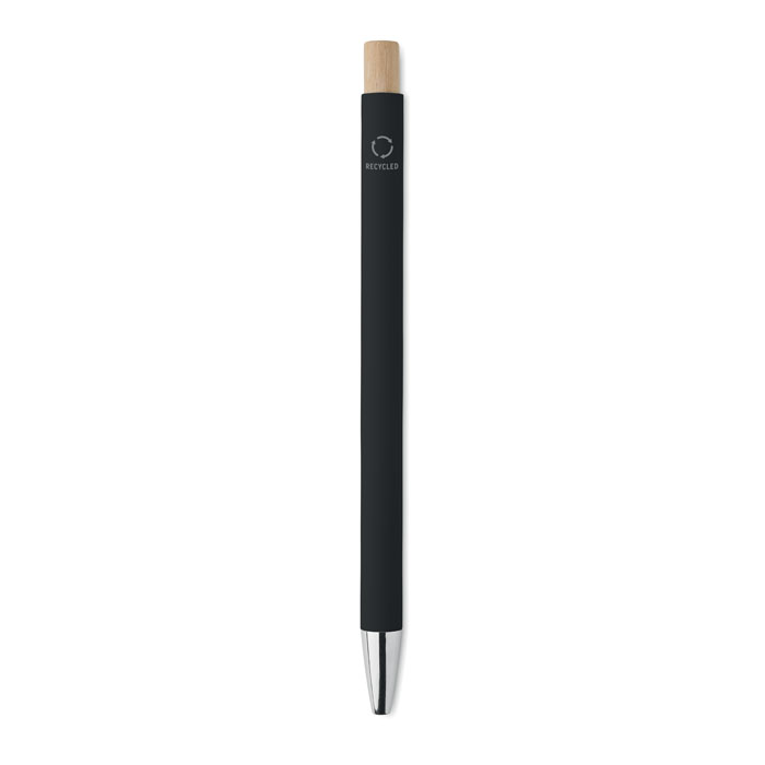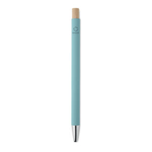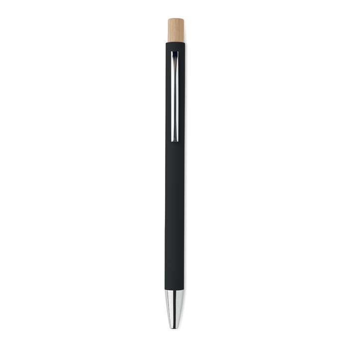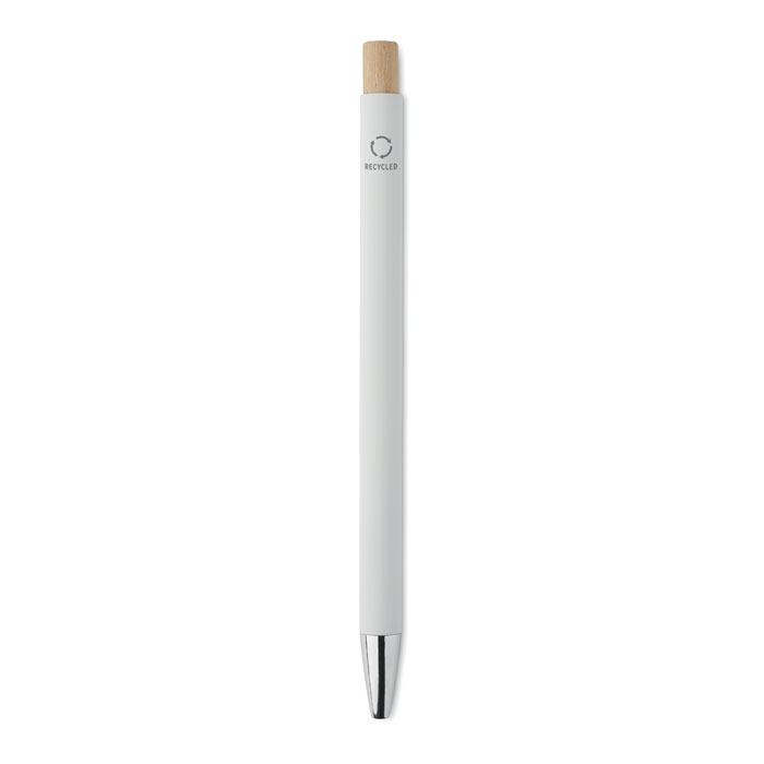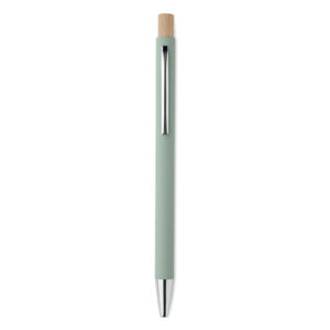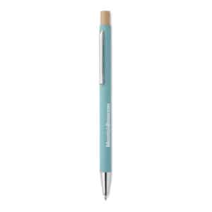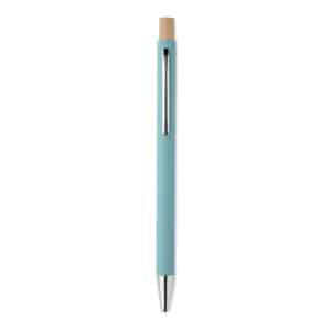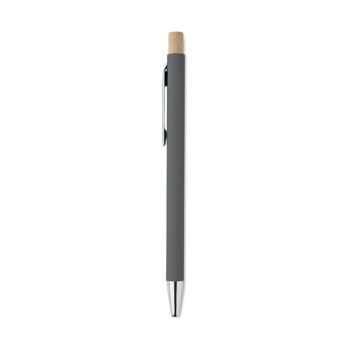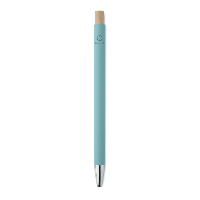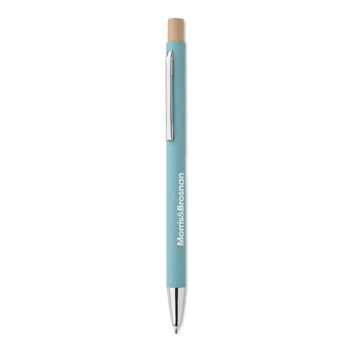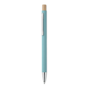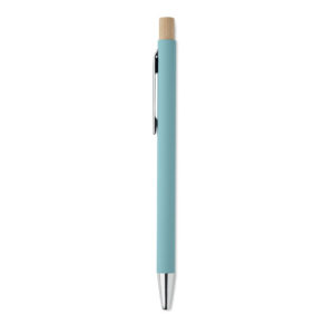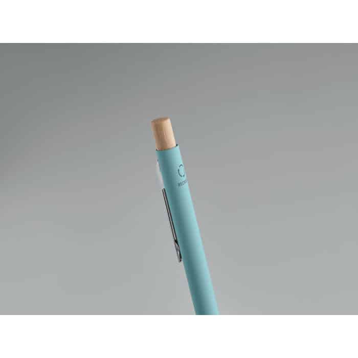 Recycled aluminium with bamboo push button. Silver tip and clip. Blue ink.