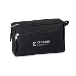 This cosmetic bag with double zipper is perfect to take along when traveling. You can store all your cosmetics, shampoo bottles and make-up in the main compartment. The smaller front pocket can be filled with smaller items. The bag is made from 600D RPET. If the hotel or bathroom does not have a place to store it, you can hang it with the attached loop.