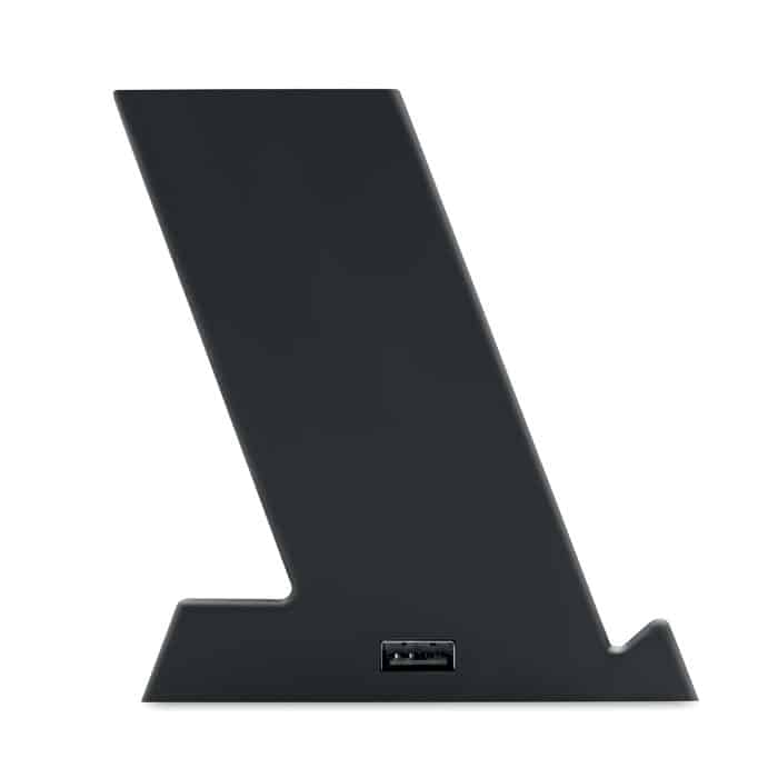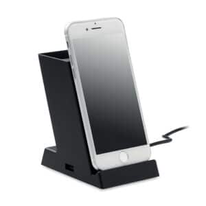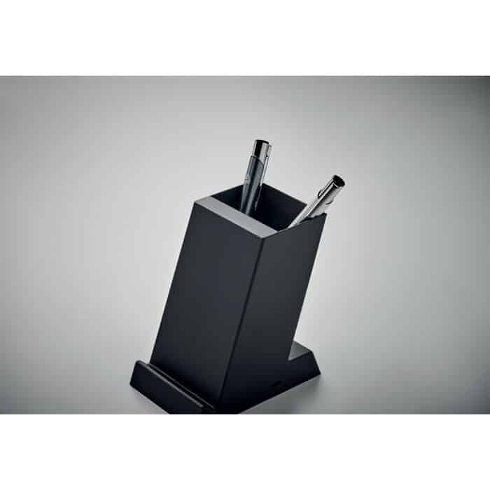 15W dual coil wireless charger with penholder in ABS. Output: DC 9V/1.67A (15W) for quick charging. 1 USB-A port power output. Compatible with latest Androids, iPhone® 8, X and newer. Keep your desk organized and your smartphone charged at the same time with this modern looking penholder. Simply place your mobile device on the penholder and it will start charging.