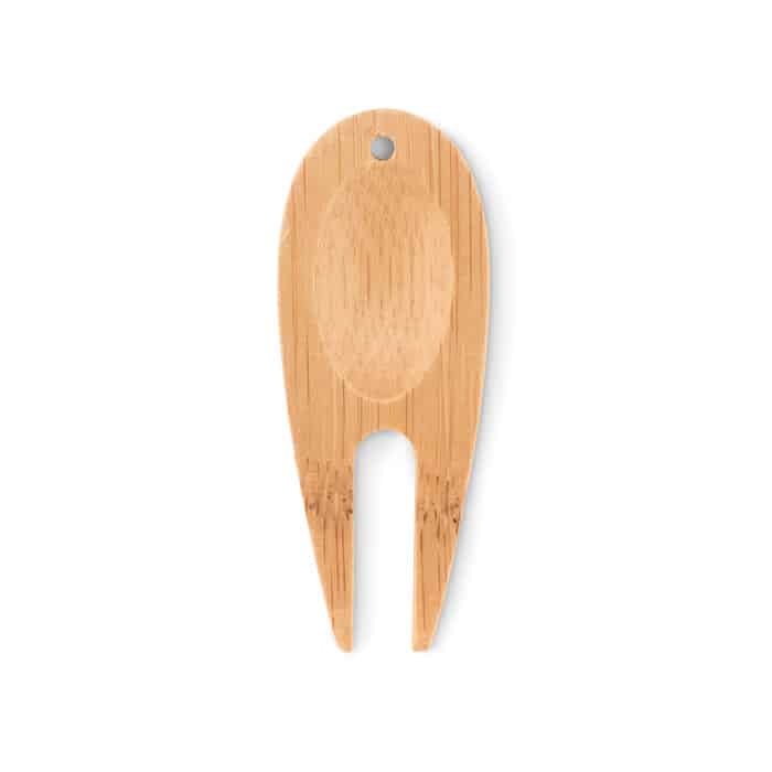 Bamboo golf divot tool. Keep the green in perfect condition with this divot tool made from bamboo. With this tool you can easily remove and hide ball marks on the green. Bamboo is a natural product, there may be slight variations in colour and size per item, which can affect the final decoration outcome.