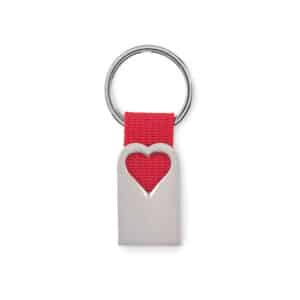 Metal key ring in matt pearl finish in hollow heart shape decoration with polyester webbing holding the metal ring. Individual gift box.