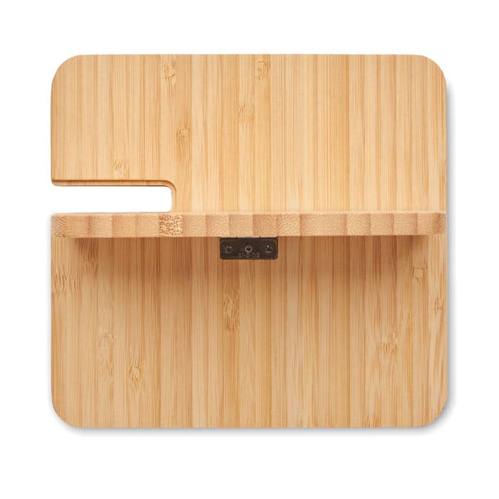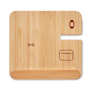 3 in 1 foldable charging station in bamboo case and phone stand. It includes a dual coil wireless charger 15W, smartwatch charger (Apple®only) and TWS charger.