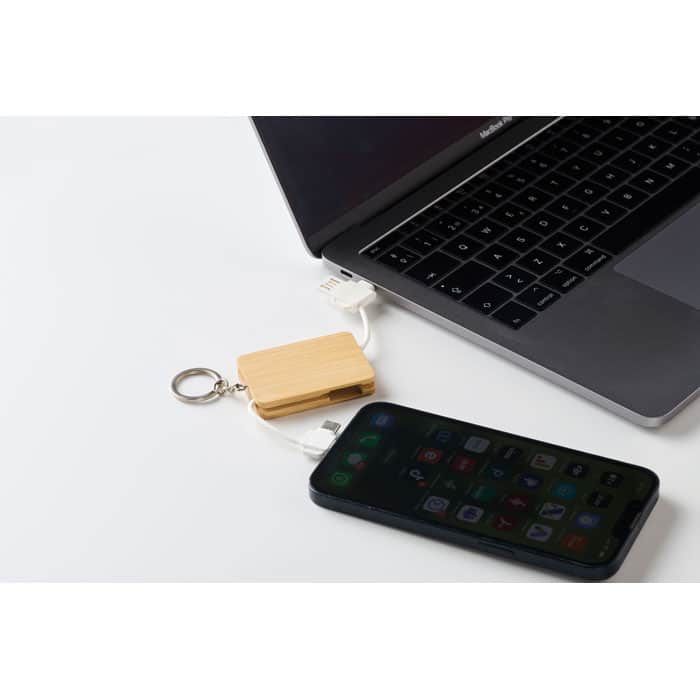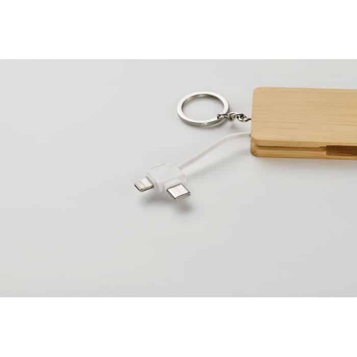 Bamboo cover key ring charging cable. Input: 2-in-1 Type-C and Type-A. Output: Type-C and micro-B (2 in 1 pin).