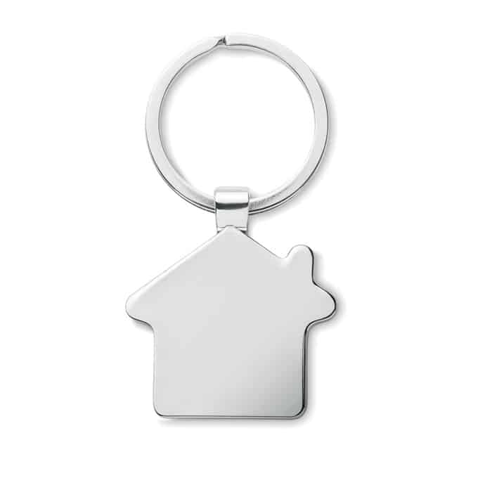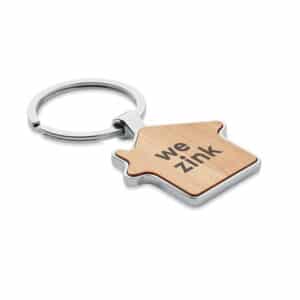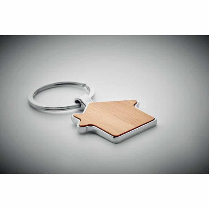 House shaped zinc alloy key ring with bamboo front. Bamboo is a natural product, there may be slight variations in colour and size per item, which can affect the final decoration outcome.