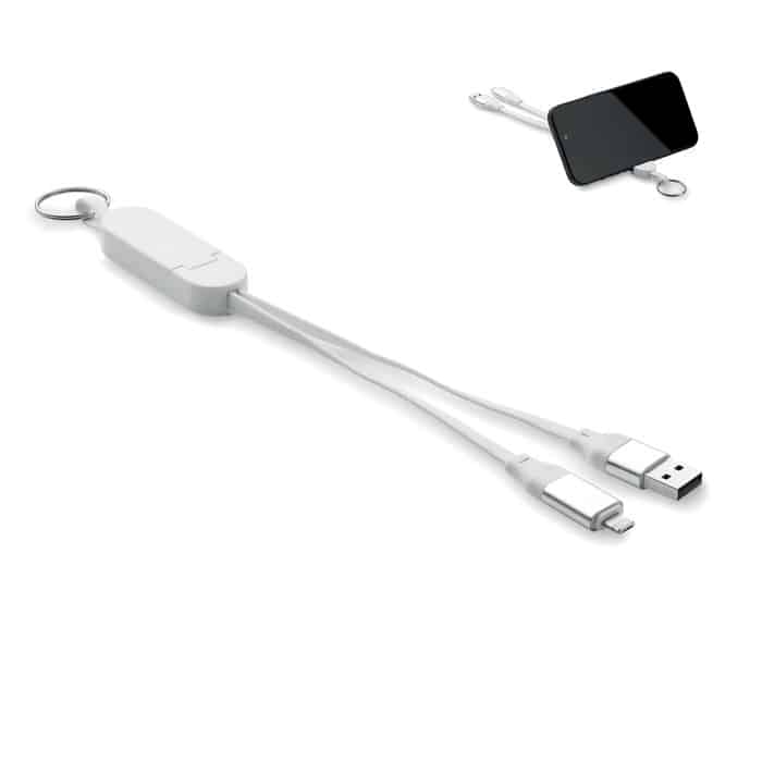 60W cable in recycled ABS casing with keyring and phone stand. Input: 2-in-1 Type-C and Type-A. Output: Type-C and micro-B (2 in 1 pin). Cable length: 26 cm.