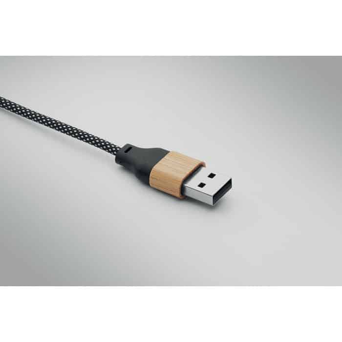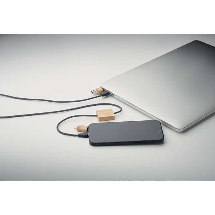 60W charging cable in RPET with bamboo details. Input: 2-in-1 Type-C and Type-A. Output: Type-C and 2 in 1 pin.