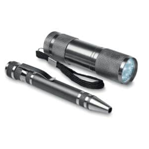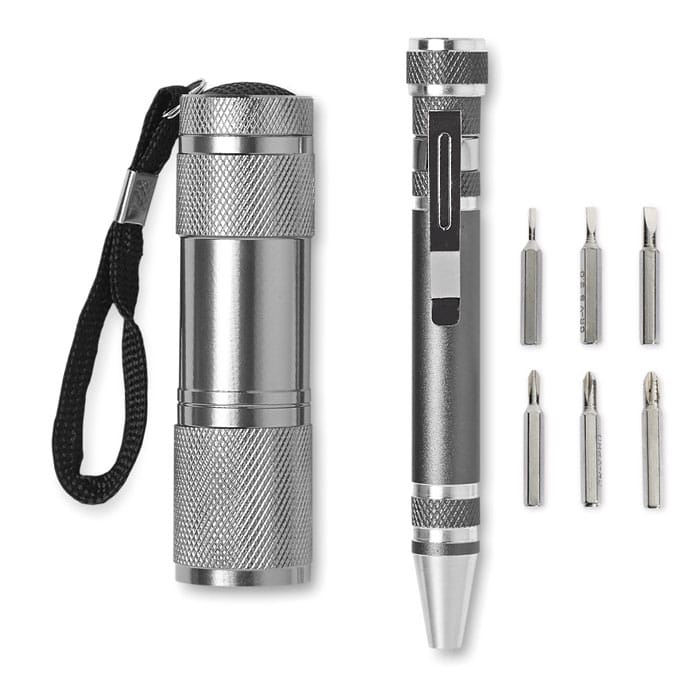 Tool set with 9 LED aluminium torch and aluminium multi tool in pen shape. Includes 3 slotted and 3 Phillips screwdriver heads. 3 AAA batteries excluded. Presented in box.