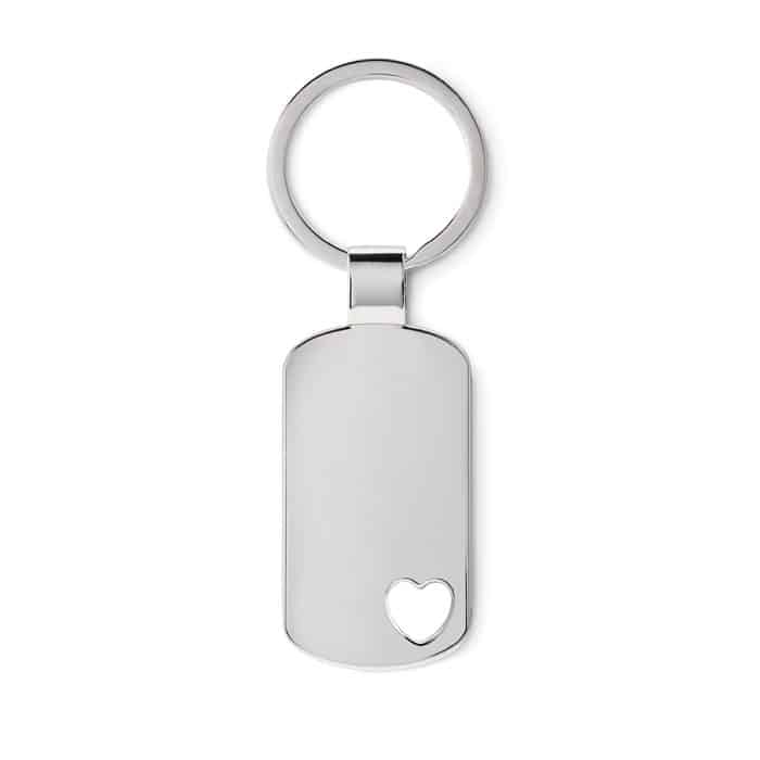 Metal key ring with heart detail on the bottom. Individually packed in box.