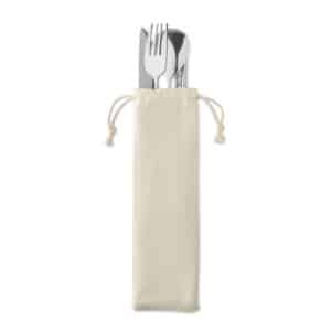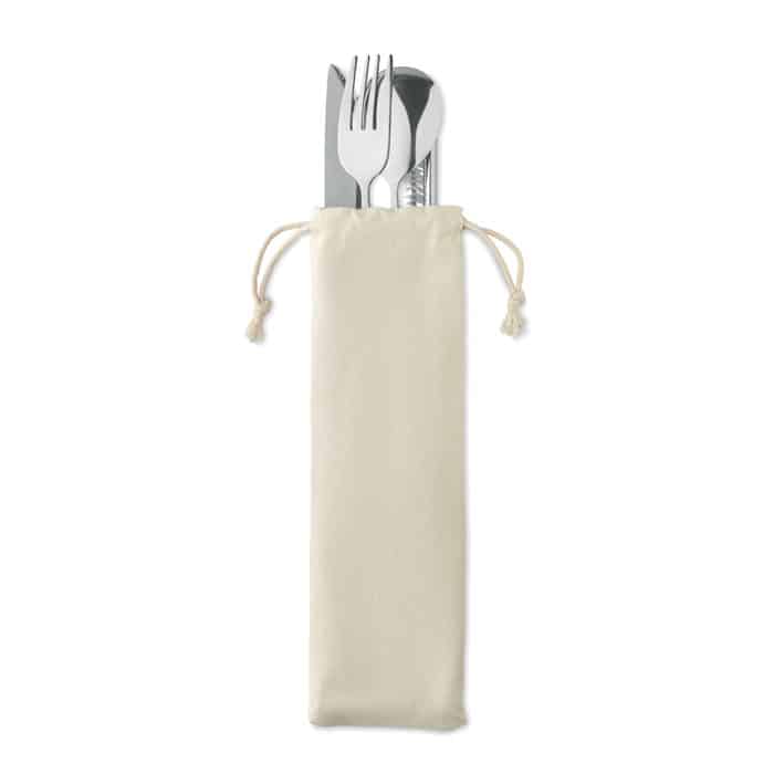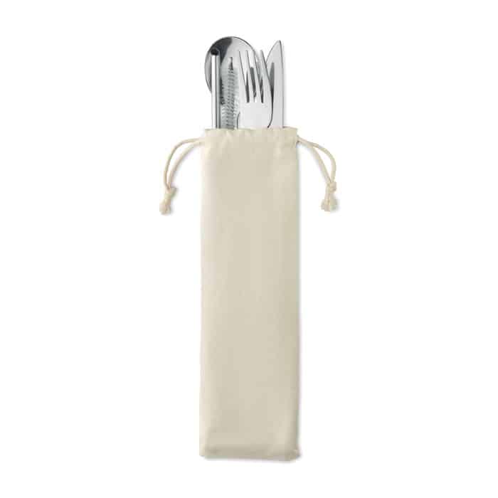 Re-usable stainless steel cutlery set with beech wood handles. As the item is supplied in a small canvas pouch, you can easily take it with you to eat a healthy lunch on-the-go, at a picnic or at work. This set includes a knife, fork, spoon and stainless steel straw and brush, so you can clean the straw after using it. All items fit in the canvas pouch with closure cord. Beech wood is a natural product, there may be slight variations in colour and size per item, which can affect the final decoration outcome.