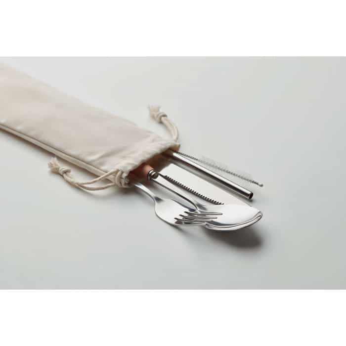 Re-usable stainless steel and beech wood handle cutlery set in canvas pouch. Includes knife, fork, spoon, stainless steel straw and cleaner brush.
