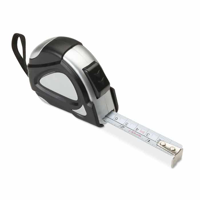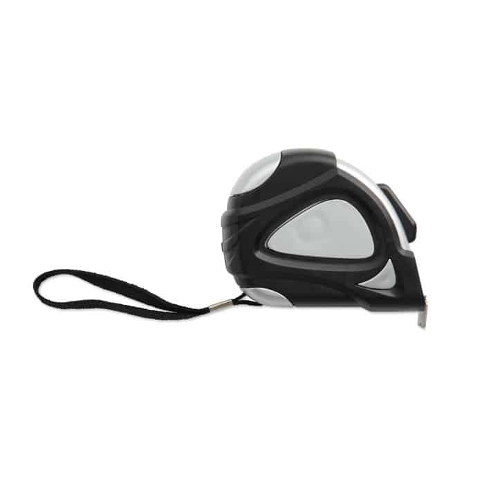 3m ABS measuring tape in silver case. Includes hand strap and shiny silver metal clip.