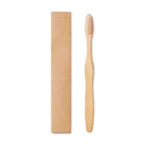 Toothbrush with bamboo handle and nylon brushes. Presented in Kraft paper box. Bamboo is a natural product, there may be slight variations in colour and size per item, which can affect the final decoration outcome. FSC®-certified | FSC 100%, N5.7, FSC-C213206