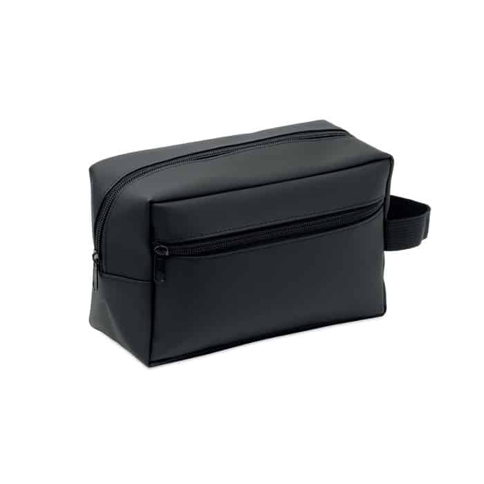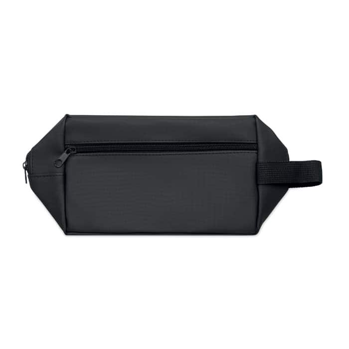 Toiletry bag made of 600D RPET polyester with PU coating and 210D RPET lining. Features zippered front pocket and handle.