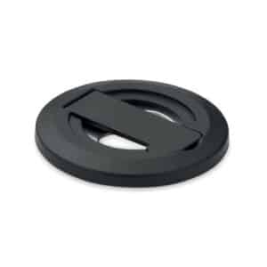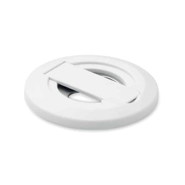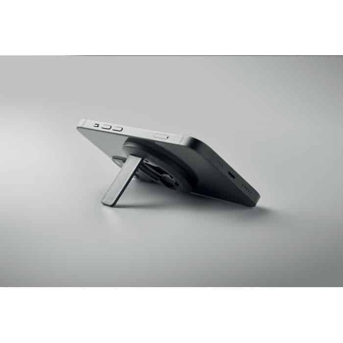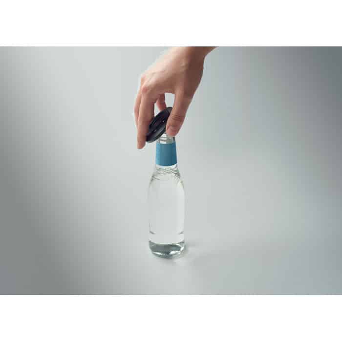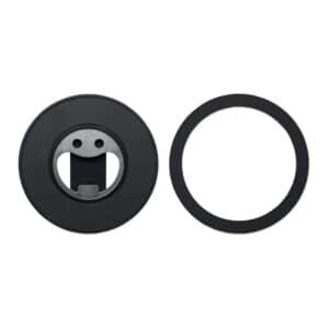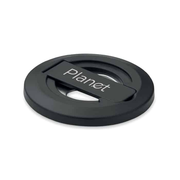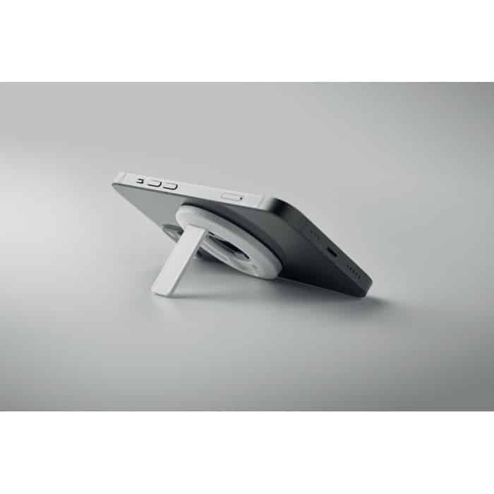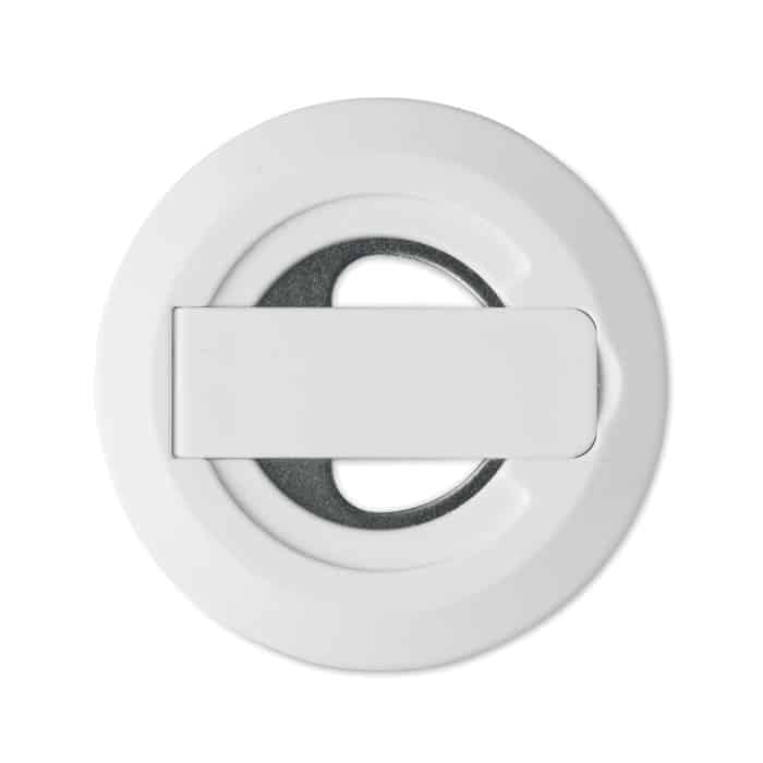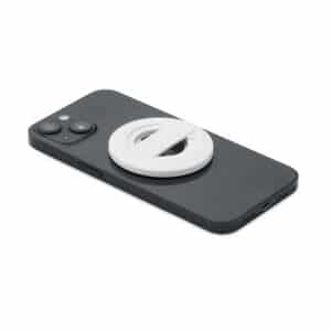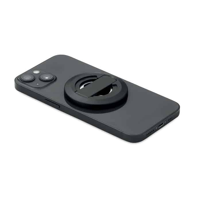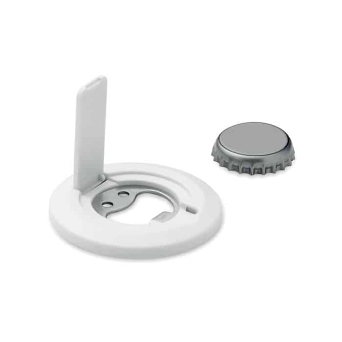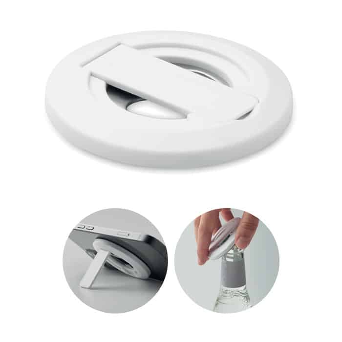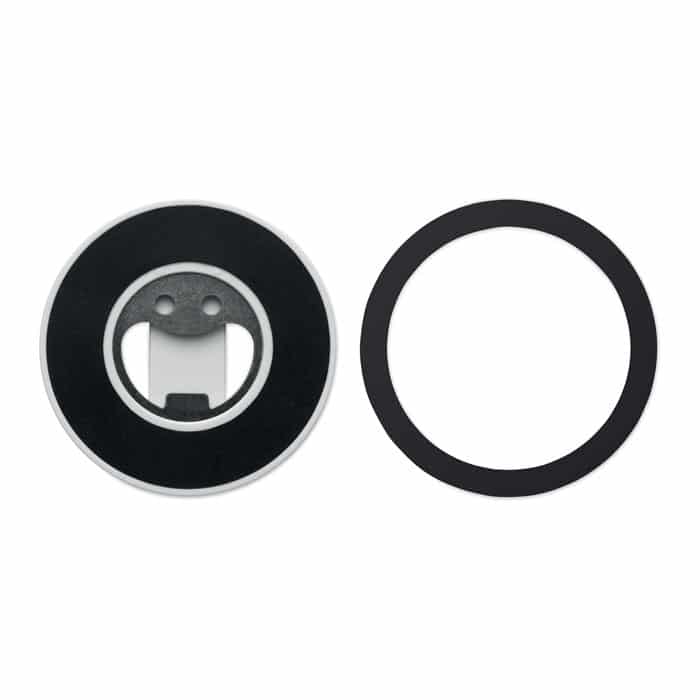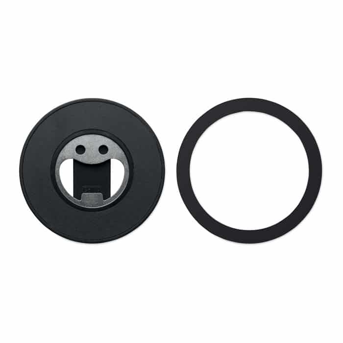 Magnetic phone holder and stand with bottle opener. Compatible with iPhone® 12 and newer. Including additional magnetic metal ring to support charging of other non-magnetic wireless chargeable phones.