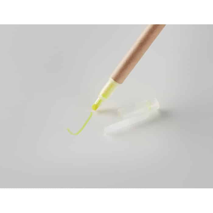 2 in 1 recycled carton barrel ball pen and yellow highlighter. Blue ink.