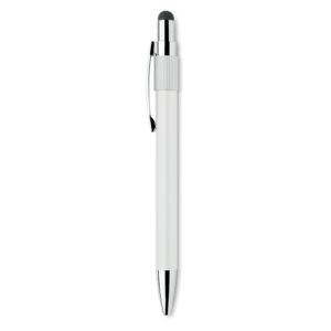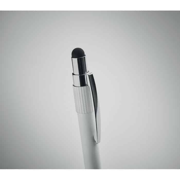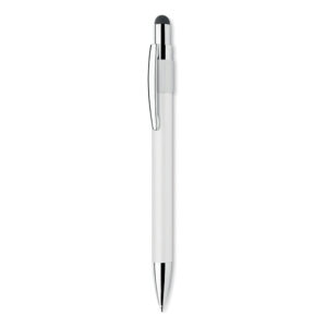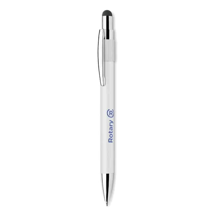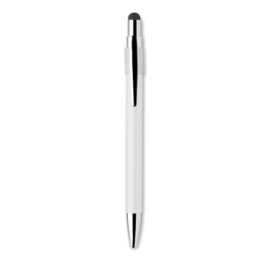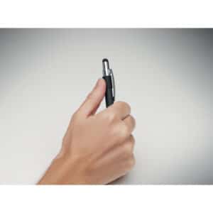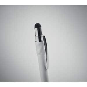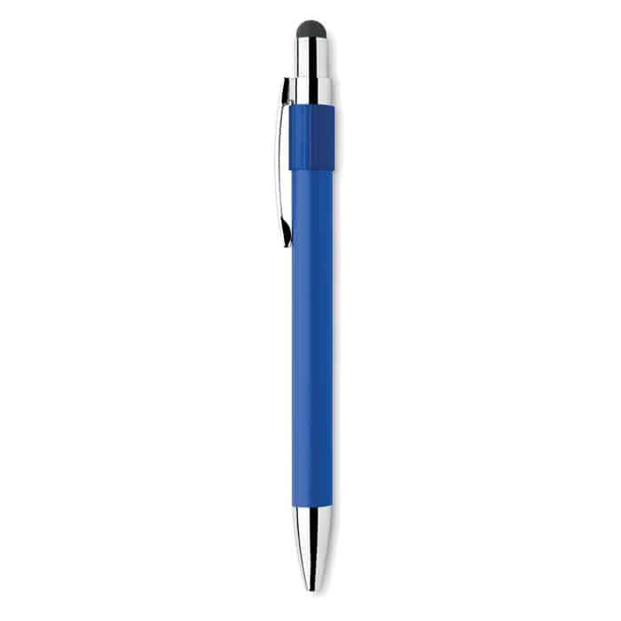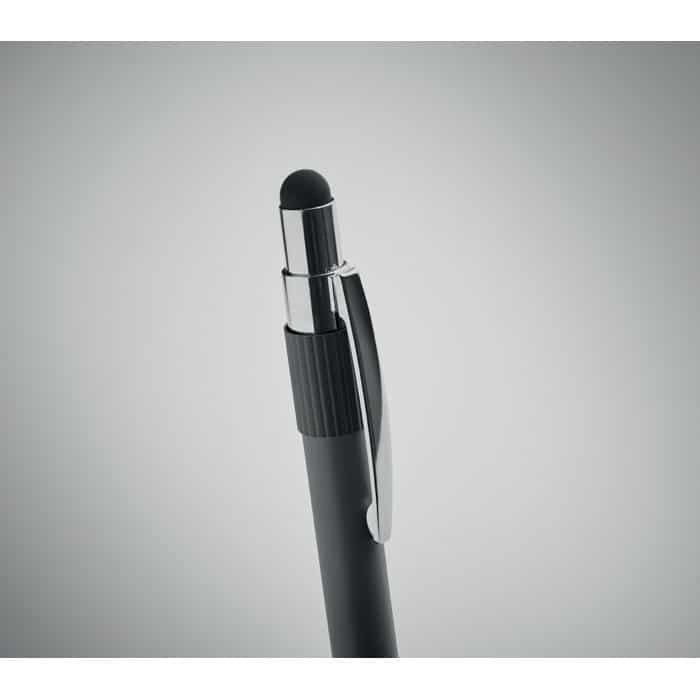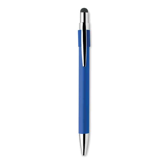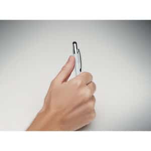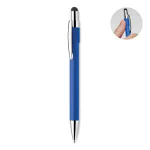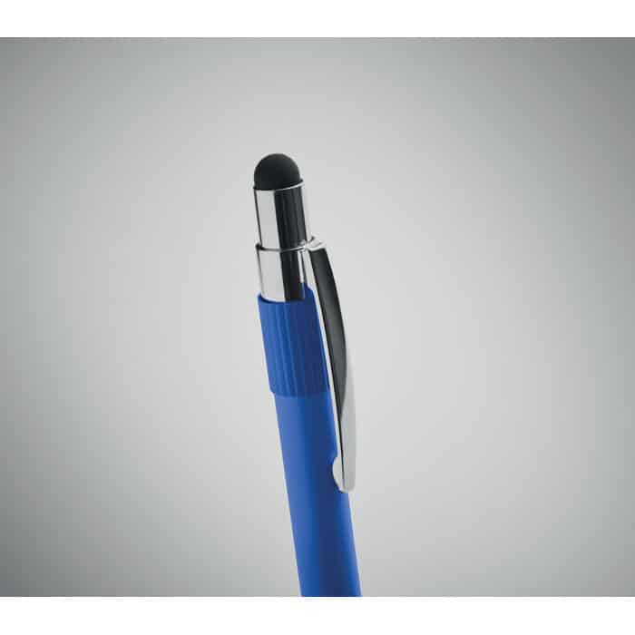 Stylus push ball spinner pen in recycled aluminium. Blue ink.