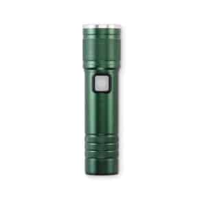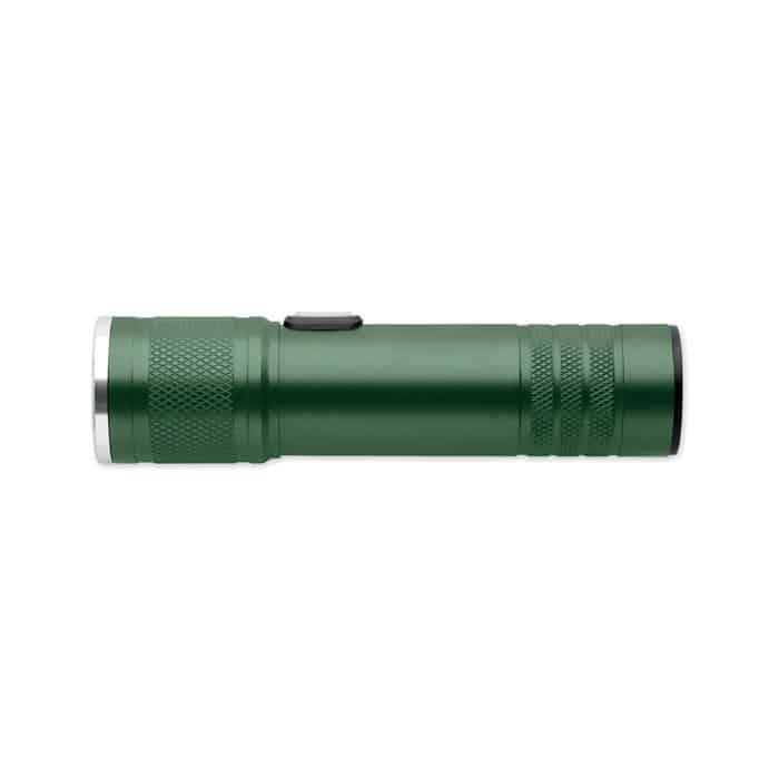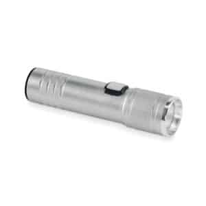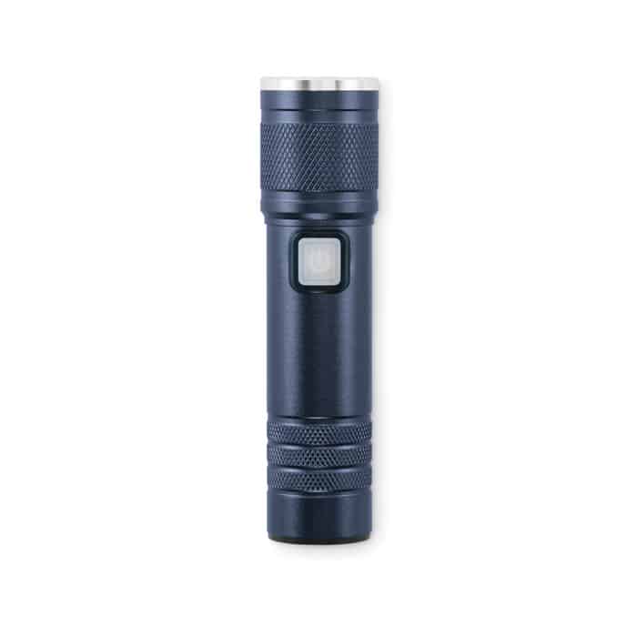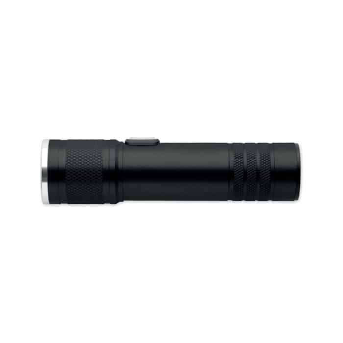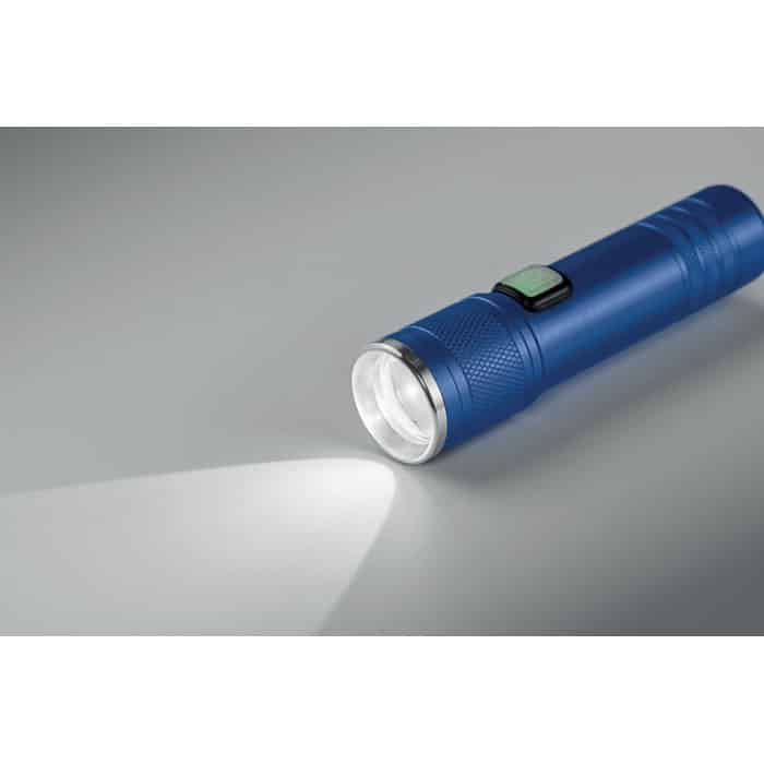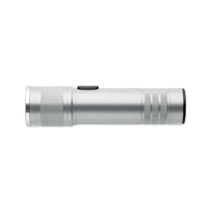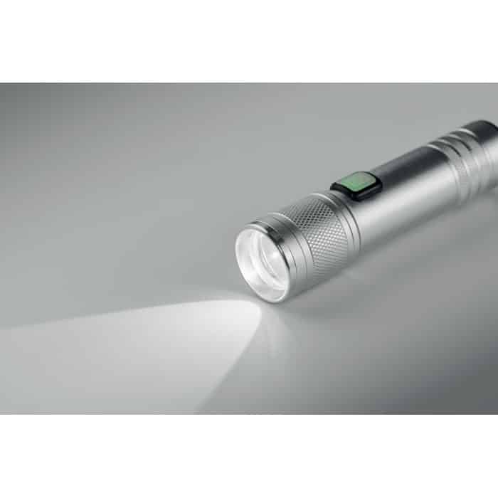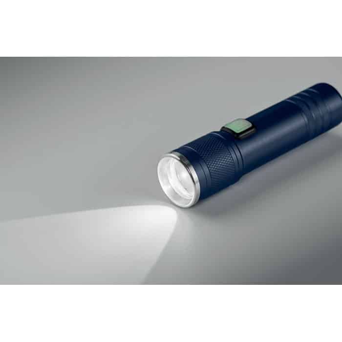 Rechargeable and expandable COB light torch in recycled aluminium. 100 lumen with 3 light settings and zoom function. Built-in 800 mAh rechargeable battery. Charging cable included.