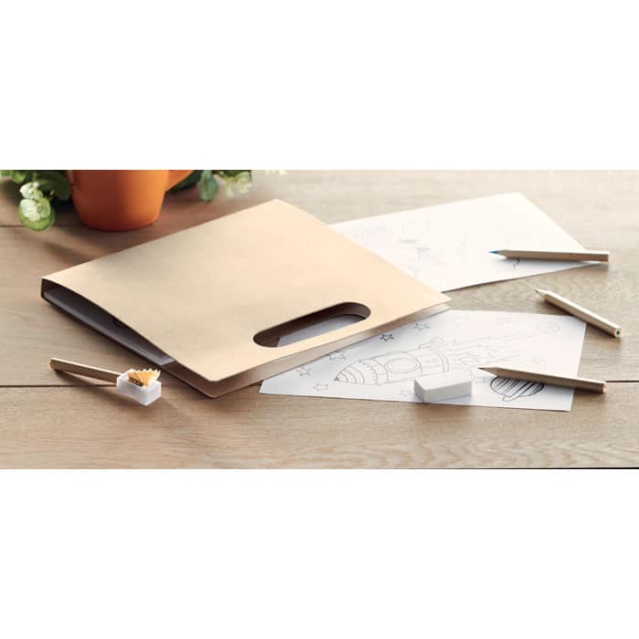 Children colouring set with 30 colouring recycled paper sheets. Includes 6 colouring pencils, sharpener and eraser.
