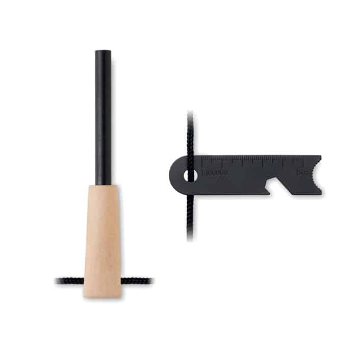 Fire starter tools in pine wood and stainless steel including a lighting stick, a multi-purpose scraper to use with your fire starter, bottle opener, precision ruler and hex key.