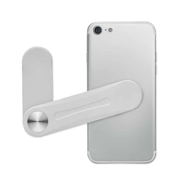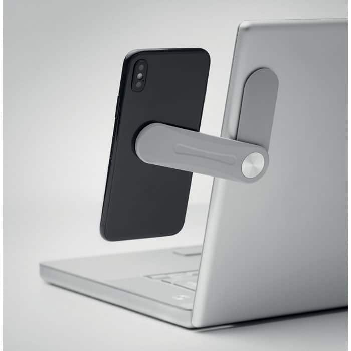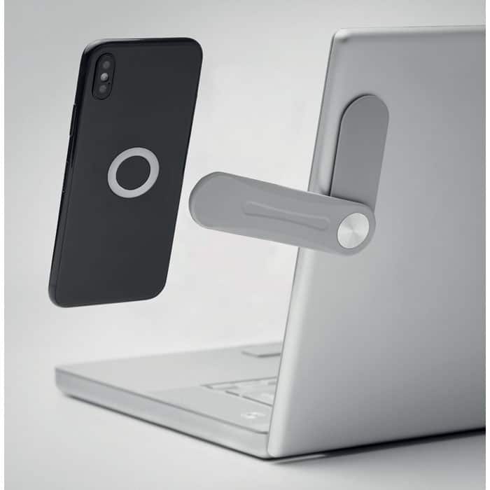 Magnetic ABS phone holder with metal ring. Attach this holder to a laptop and because it is magnetic, it can hold your smartphone. There is a 3M sticker on the back to attach it. Ideal for at the office when you use both your laptop and phone frequently.