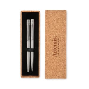 Recycled stainless steel pen set with ball pen and roller ball. Presented in matching cork box. Blue and black ink respectively. Cork is 100% natural material. Due to its structural nature and surface porosity the final print result per item may have deviations.