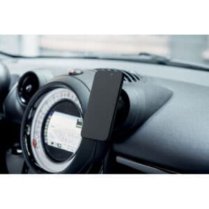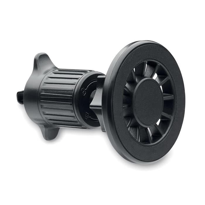 360 degree rotation magnetic air vent mount phone holder in ABS. Includes additional magnetic metal ring to support charging of non-magnetic wireless chargeable phones.