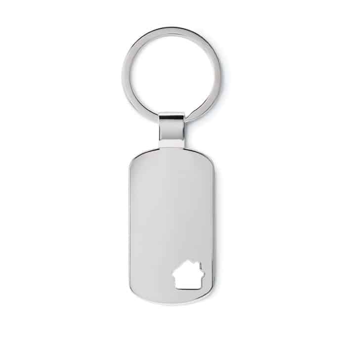 Metal key ring with house detail on the bottom. Individually packed in box.