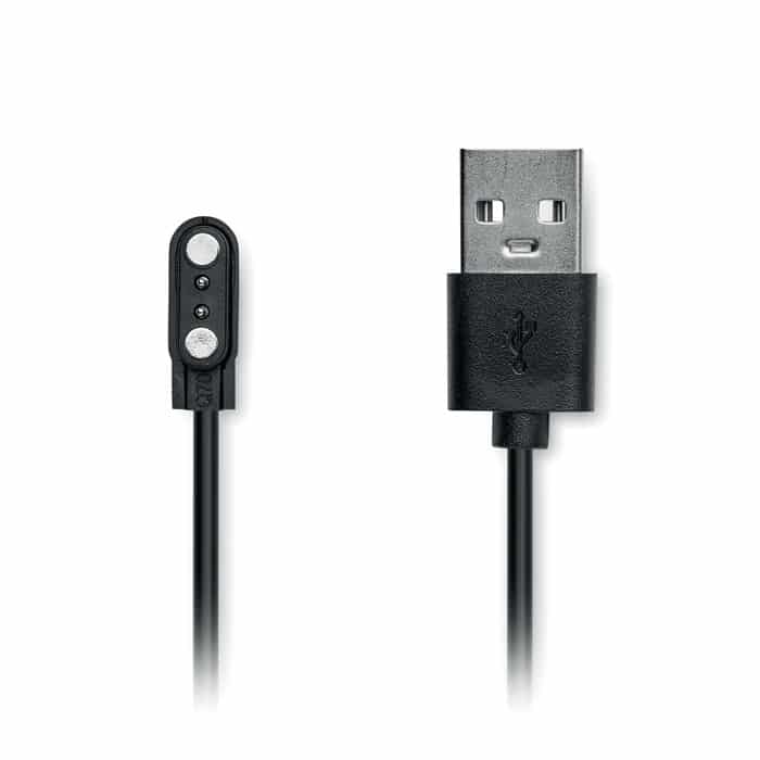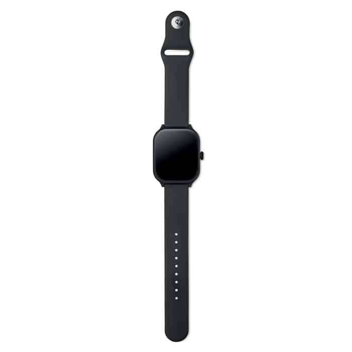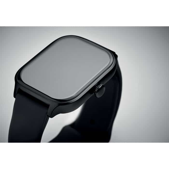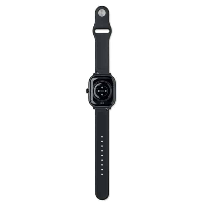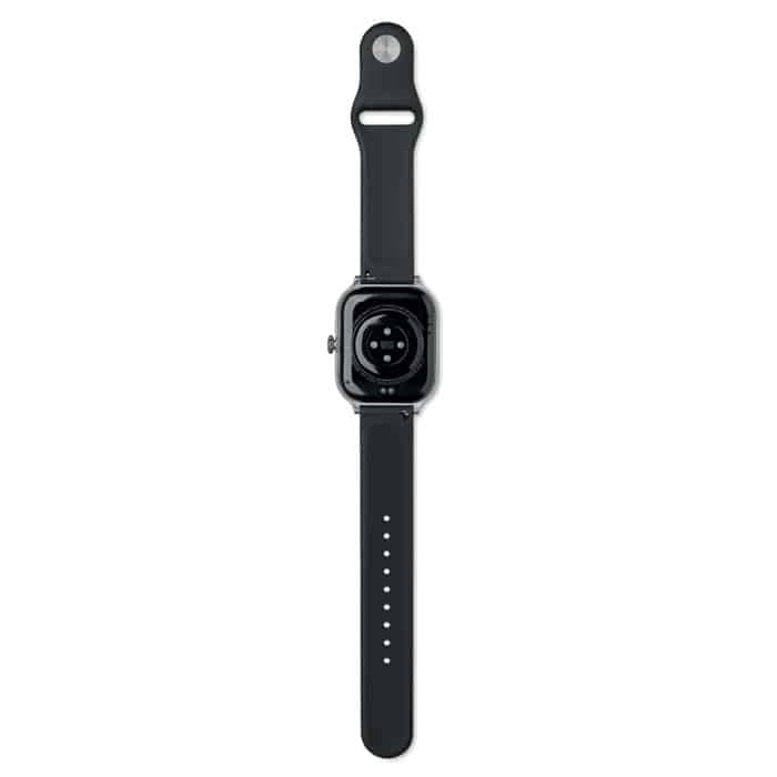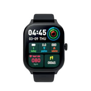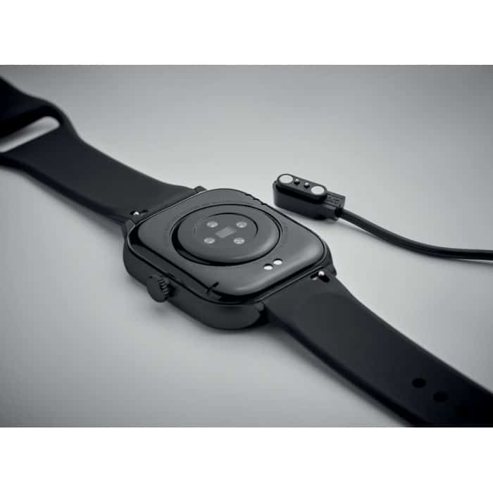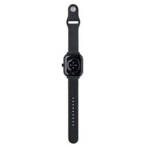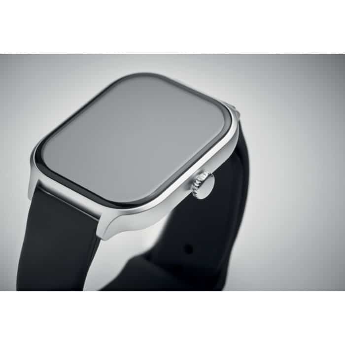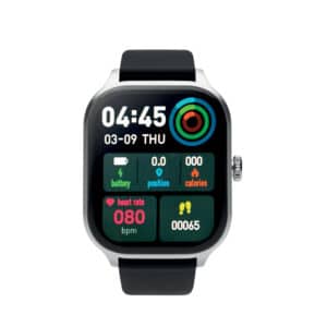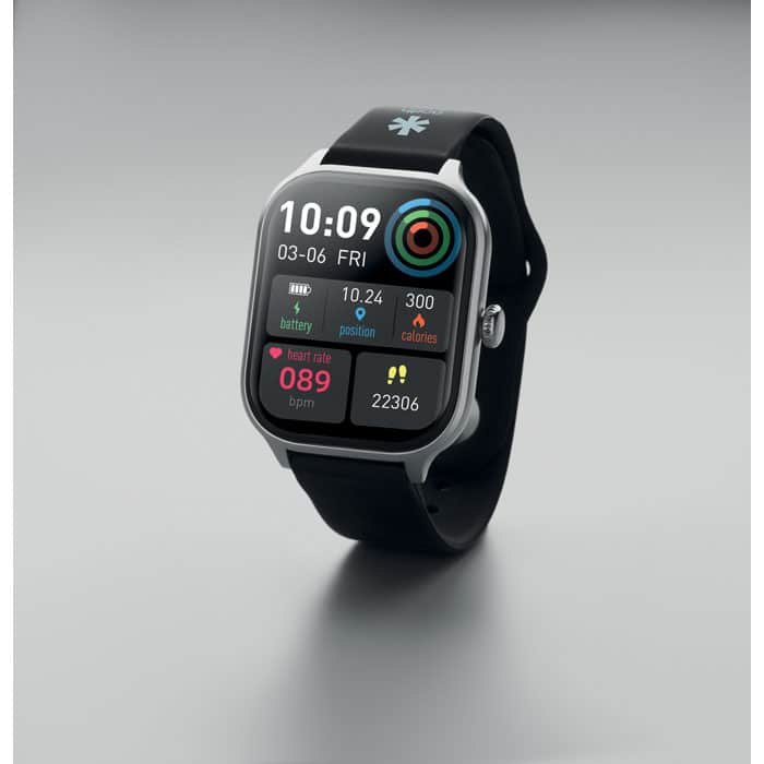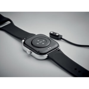 5.4 wireless smart health watch in zinc alloy with silicone strap. 2.01 inch touch LCD display. Rechargeable Li-Pol 180 mAh battery. Requires a free app (HryFine available in both iOS and Android).