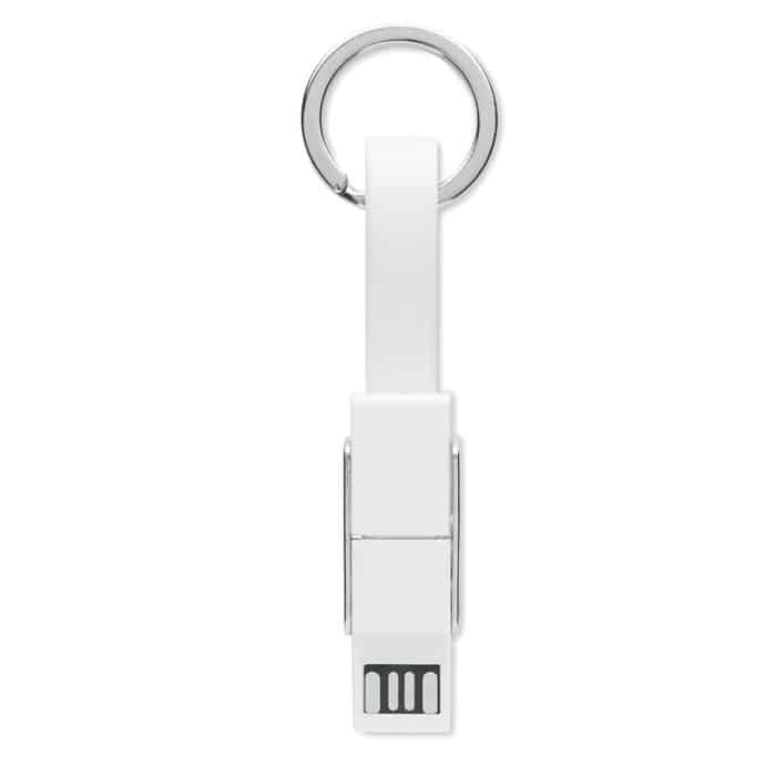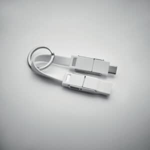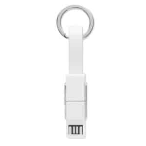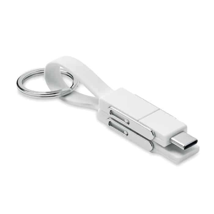 Key ring with 4-in-1 charging cable. In/Output: Type-C x2, Type-A, Micro USB.