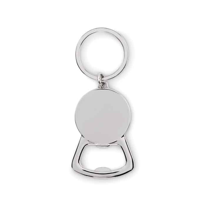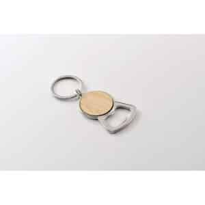 Metal bottle opener key ring with bamboo detail.