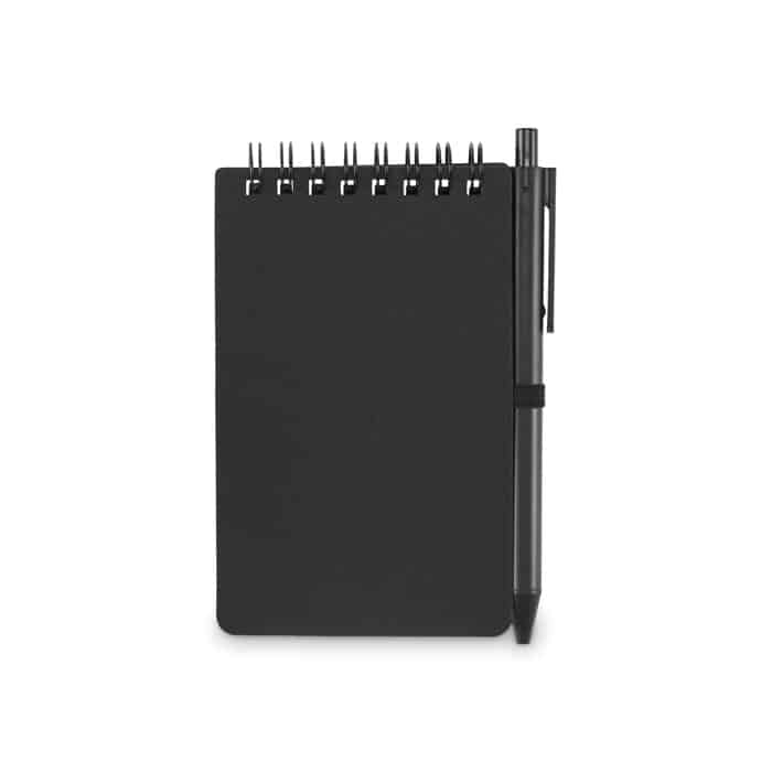 Water repellent notepad in PP cover with pen. Twin-wire. Mineral paper 120 gr/m², 50 sheets lined. Blue ink. Elastic closure strap and pen holder.