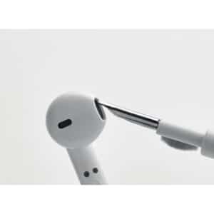 Pen with TWS cleaning set. It has a True Wireless Stereo (TWS) earbud cleaning kit: metal nib, sponge and brush. Blue ink.
