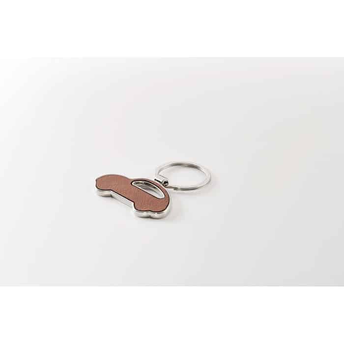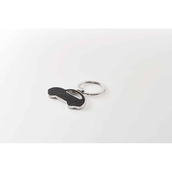 Car shaped metal key ring with recycled PU leather inlay.