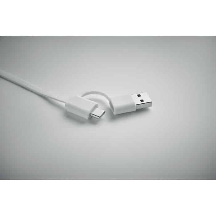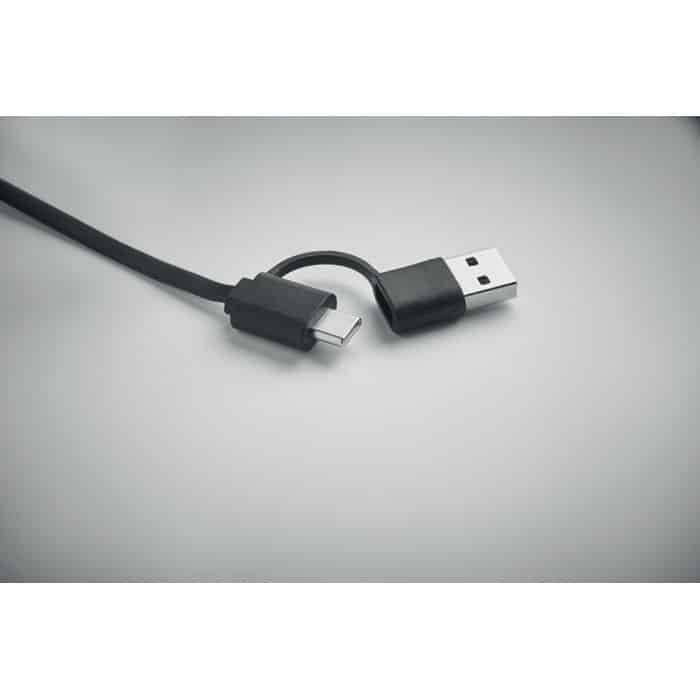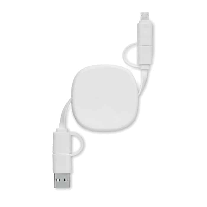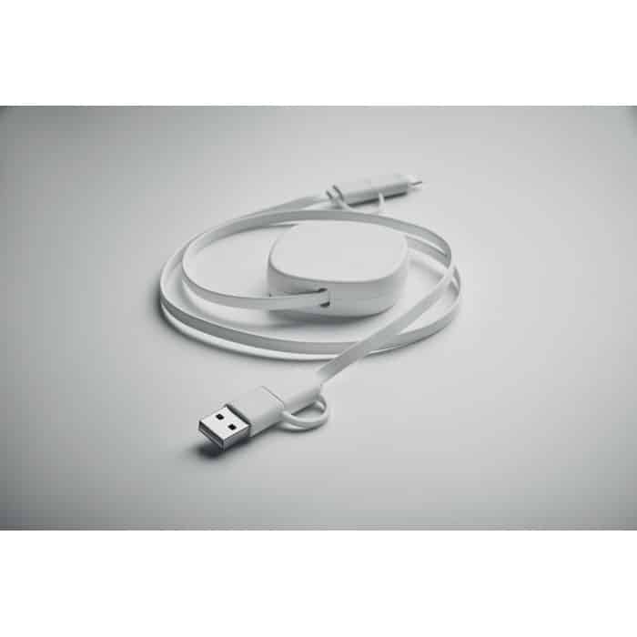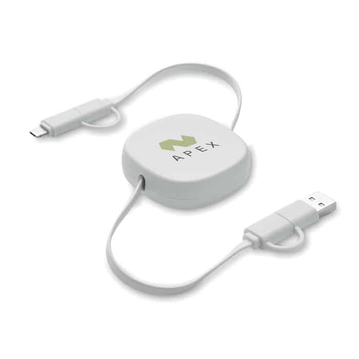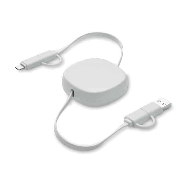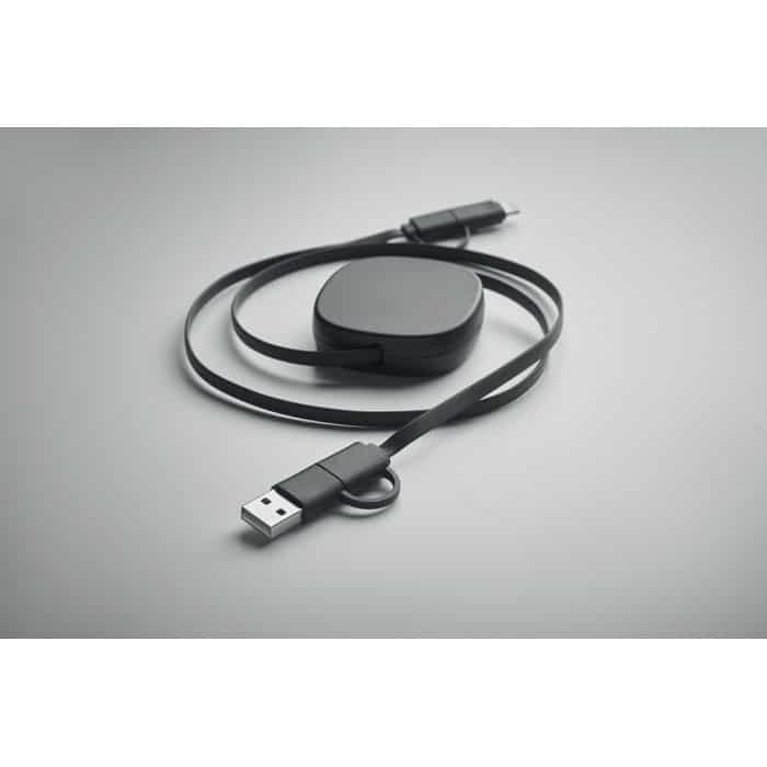 60W retractable cable in recycled ABS casing. Input: 2-in-1 Type-C and Type-A. Output: Type-C and micro-B (2 in 1 pin). Cable length: 80 cm.