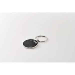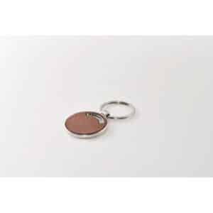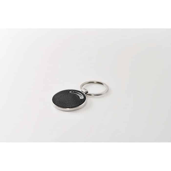 Round shaped metal key ring with recycled PU leather inlay.