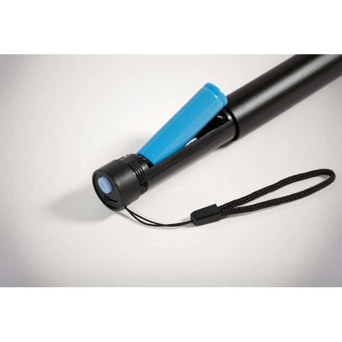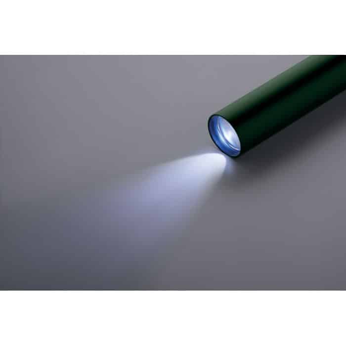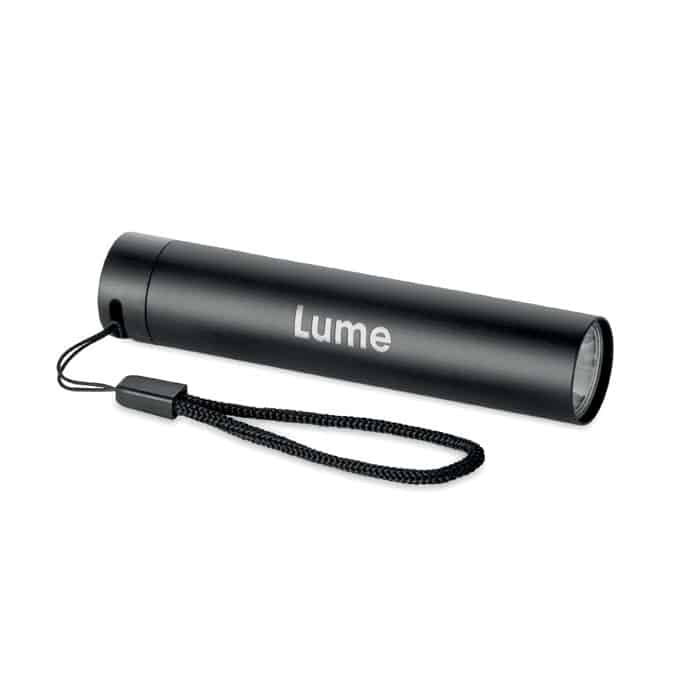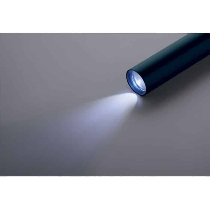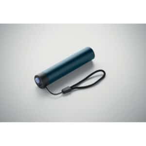 Recycled aluminium rechargeable torch 110 lumen with 3 light settings. 1 replaceable and rechargeable 14500 lithium battery 400 mAh.