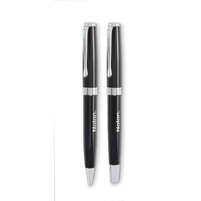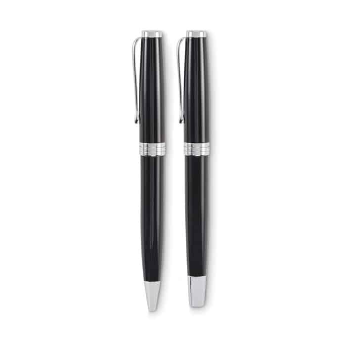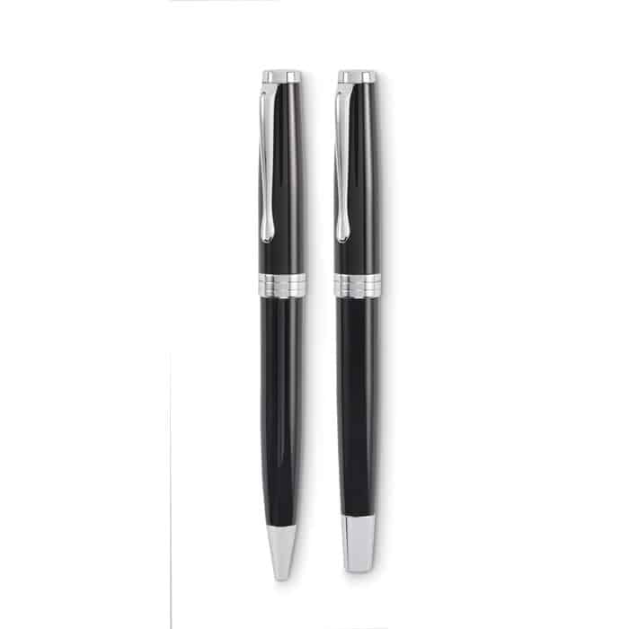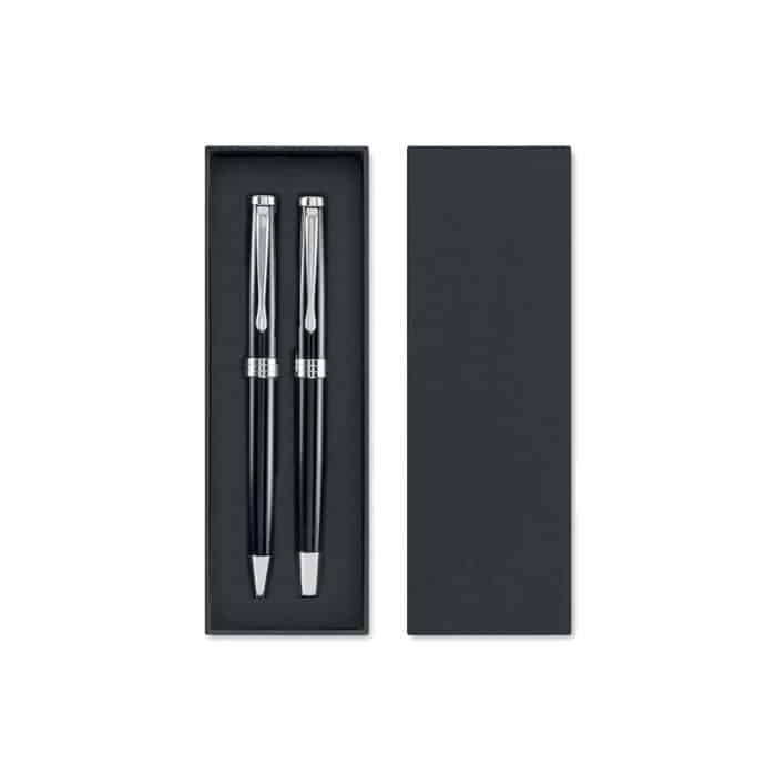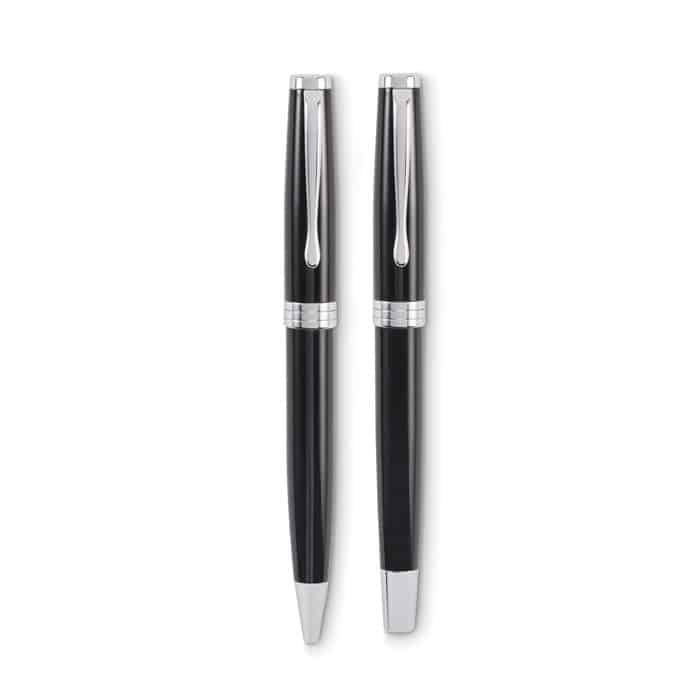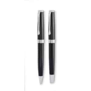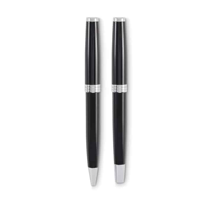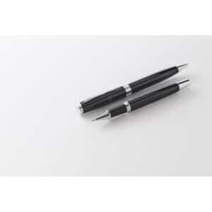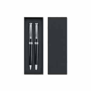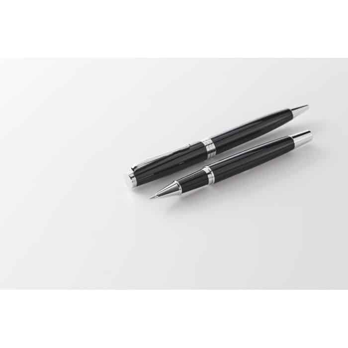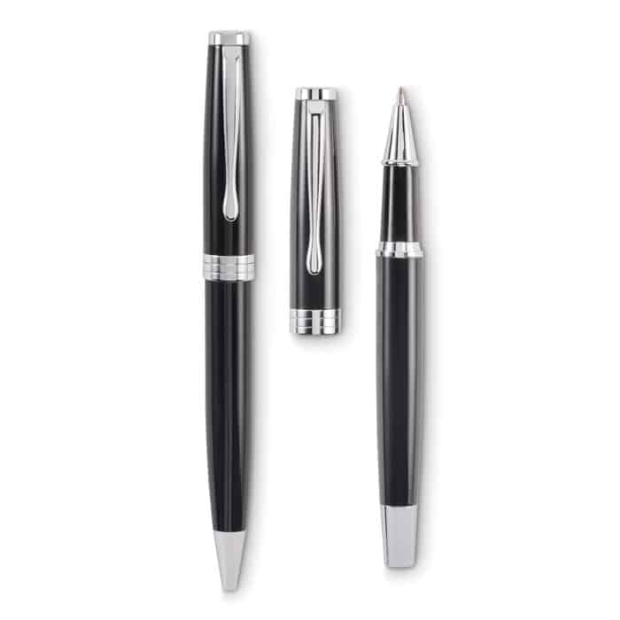 Set of twist ball pen and roller in recycled stainless steel barrel. Blue and black ink respectively. Presented in gift box.