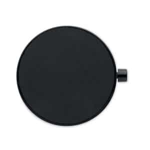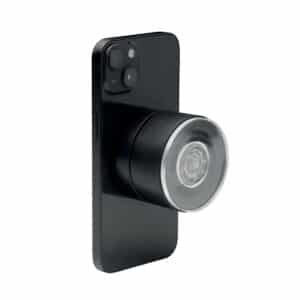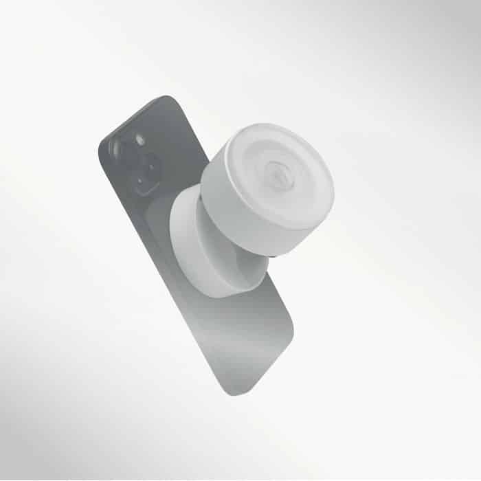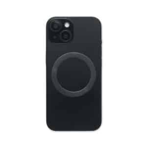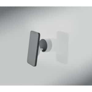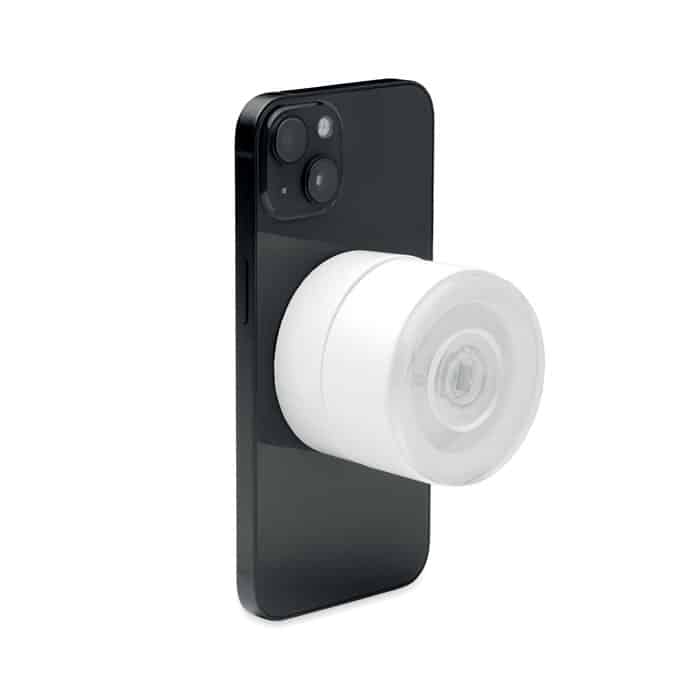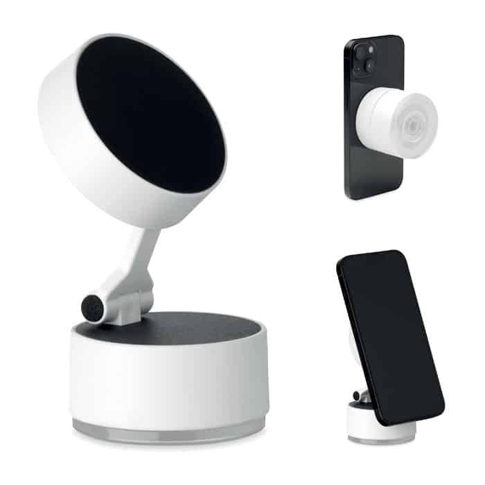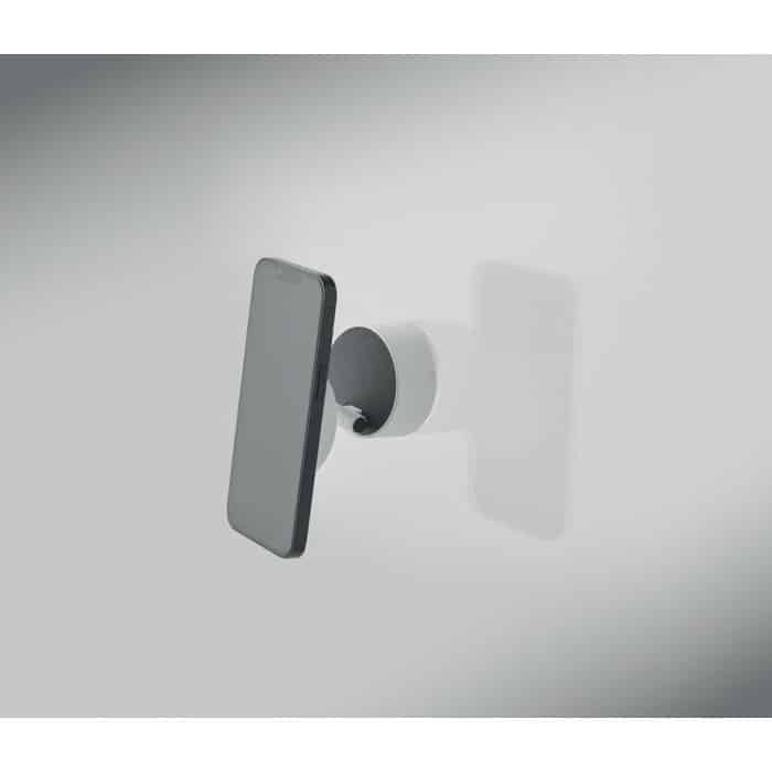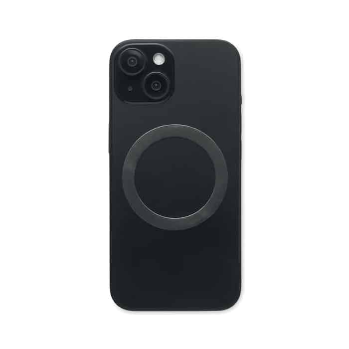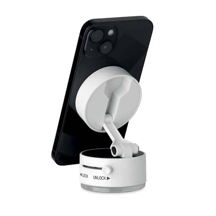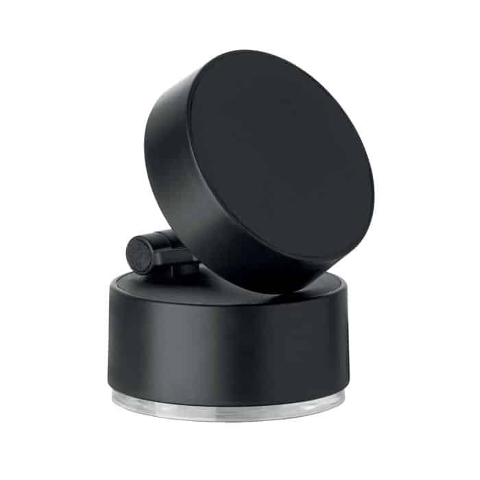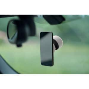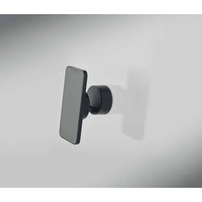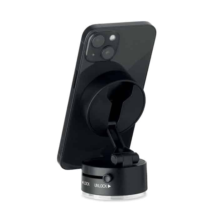 Magnetic phone holder in ABS. Vacuum suction hold. Compatible with iPhone® 12 and newer. Including additional magnetic metal ring to support charging of other non-magnetic wireless chargeable phones.