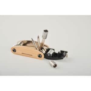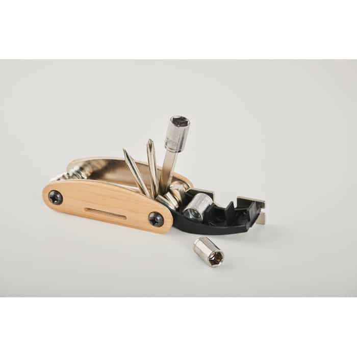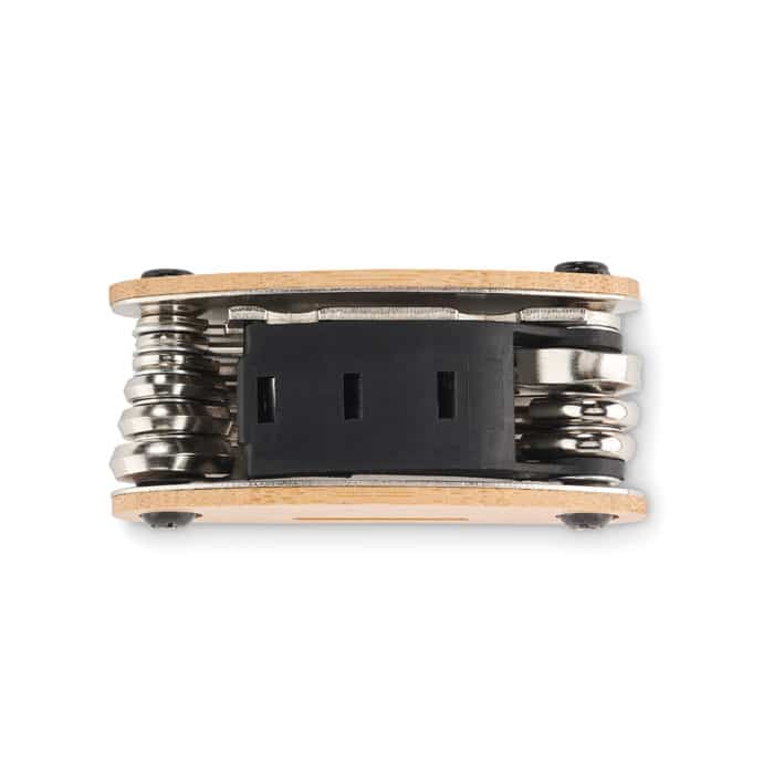 Stainless steel multi-function pocket tool with bamboo cover. 11 functions. It includes: hex keys, flat wrench , sleeve extension, Phillips screwdriver and socket spanner.