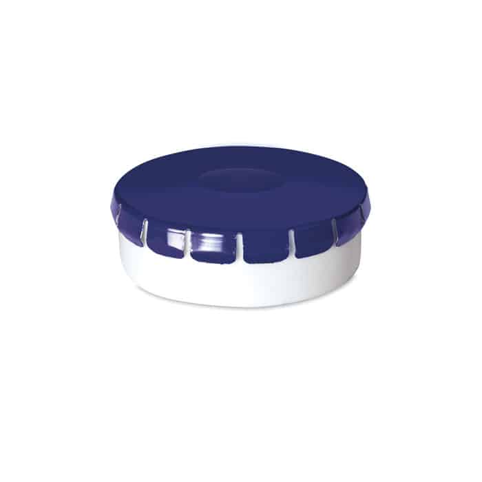 12 gr sugar-free mints in plastic container and tin cover and plastic bottom. Easy-press opening.
