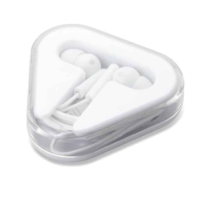 Earphones in PVC housed in a triangular PS case. Cable length 120 cm.