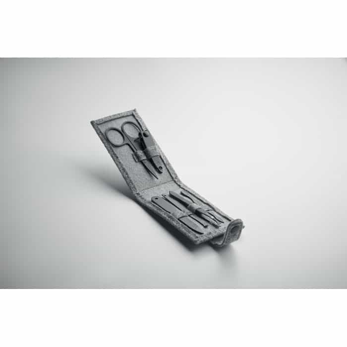 6 piece stainless steel manicure set in rectangular RPET felt pouch.