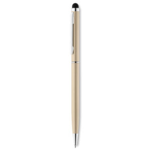 Twist action ball pen in recycled aluminium with stylus and shiny chrome clip. Blue ink.