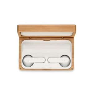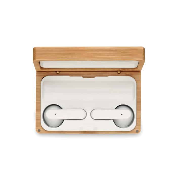 TWS earbuds with microphone in bamboo case. Includes 1200 mAh emergency power bank with type-C input and type-A output. Auto-pairing.