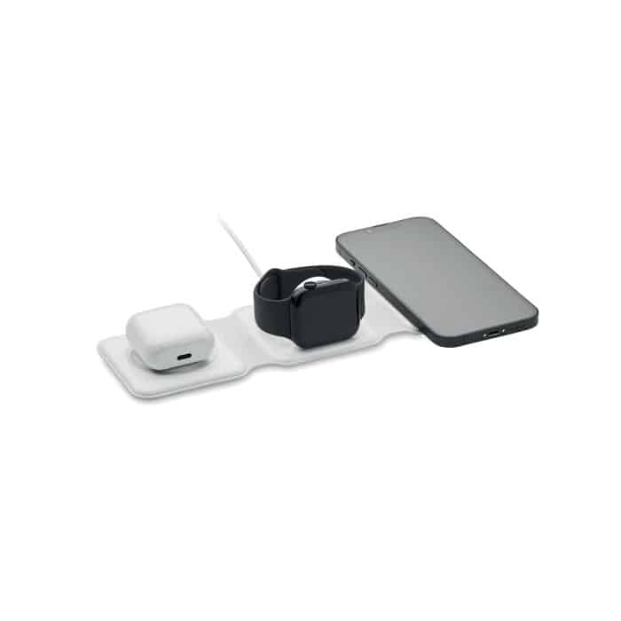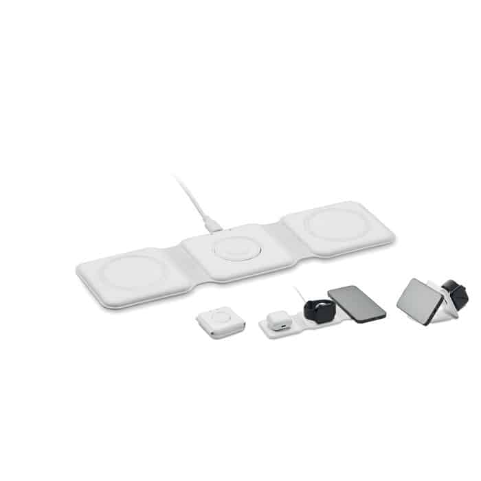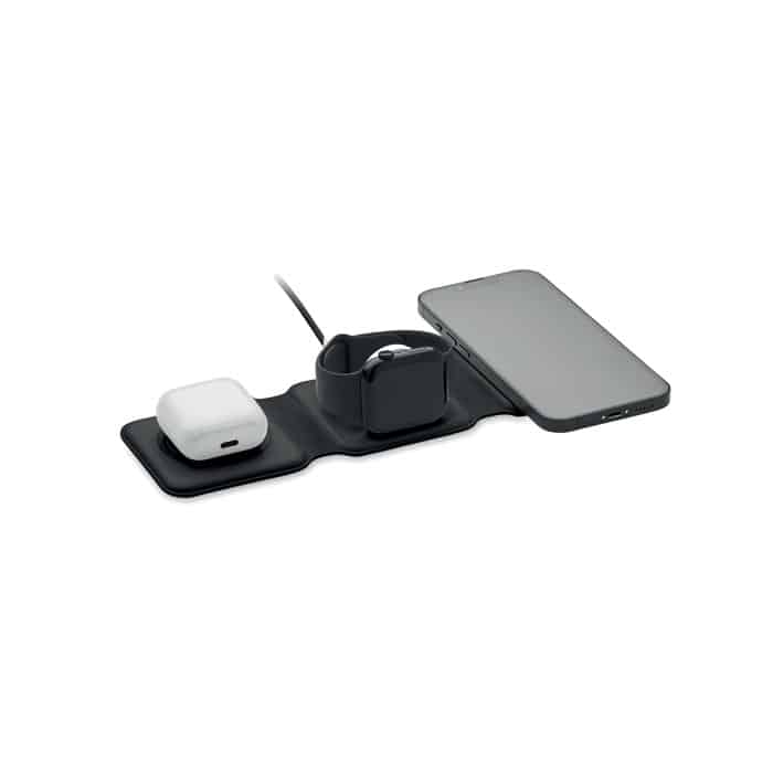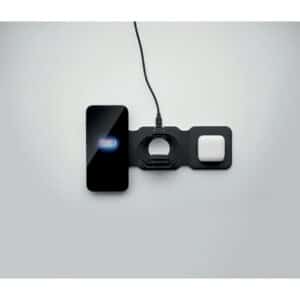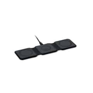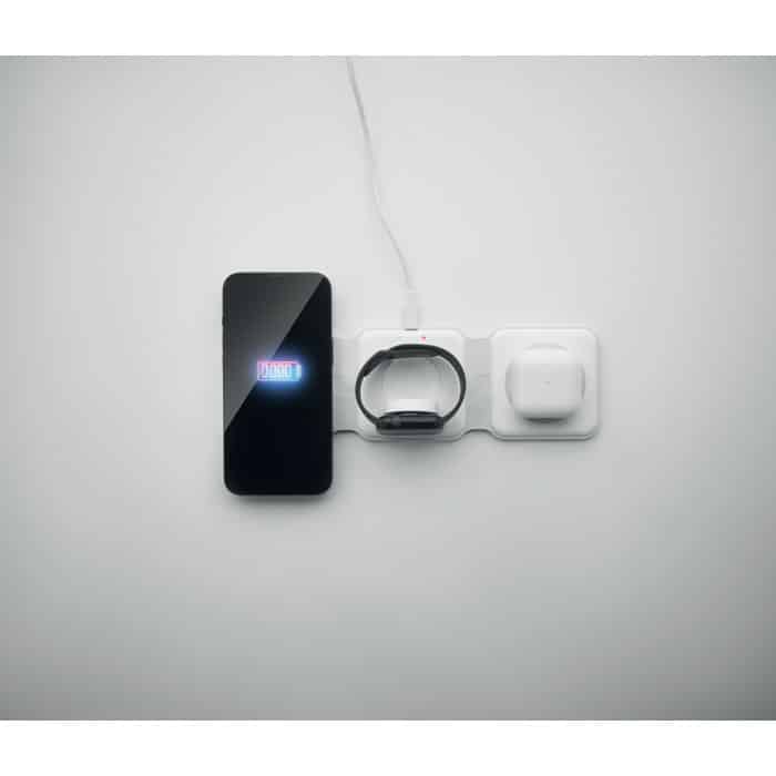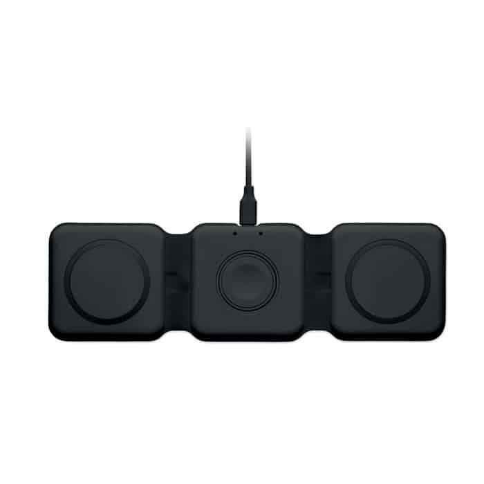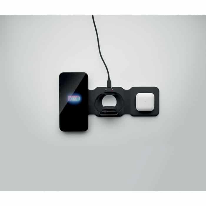 3 in 1 foldable charging station in ABS. It has 3 wireless charging spots (15W). Input: 2-in-1 Type-C and Type-A.