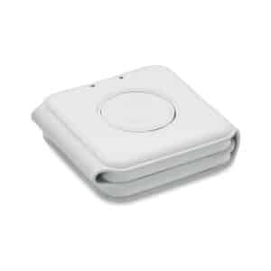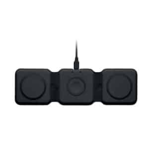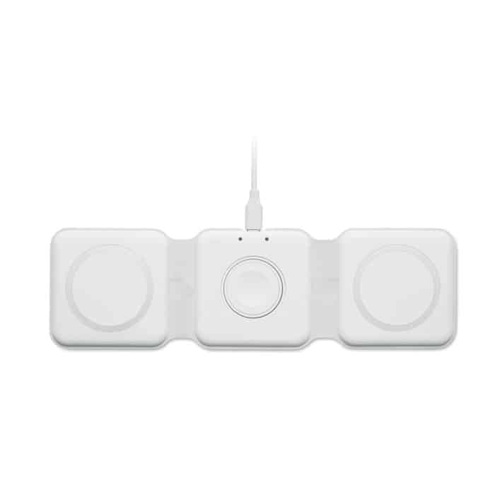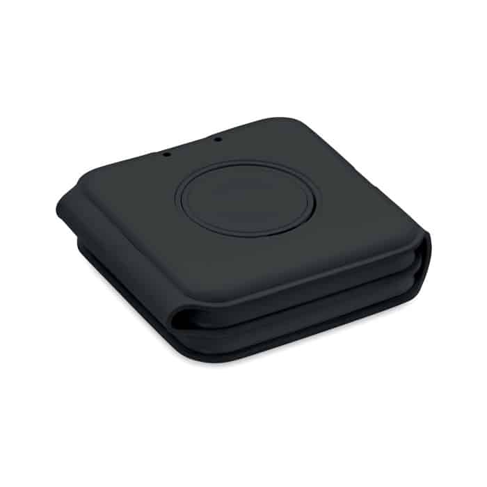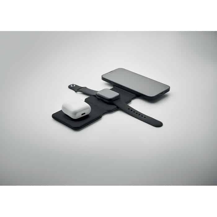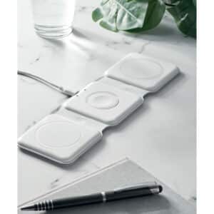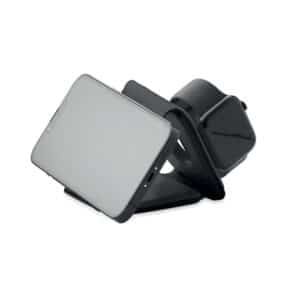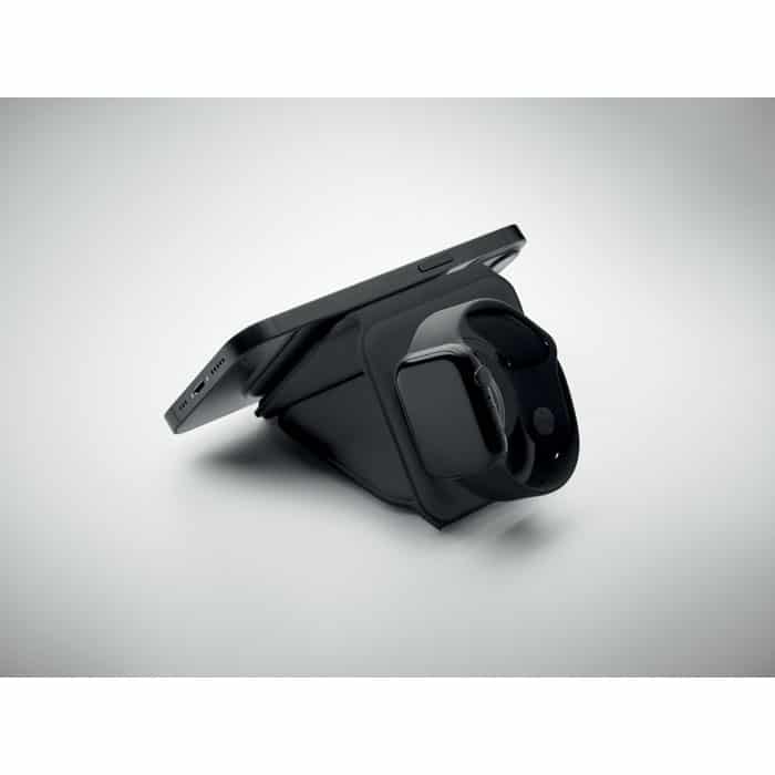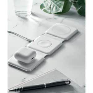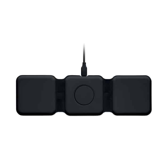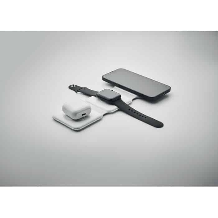 3 in 1 foldable charging station in ABS. It has 3 wireless charging spots (15W). Input: 2-in-1 Type-C and Type-A.
