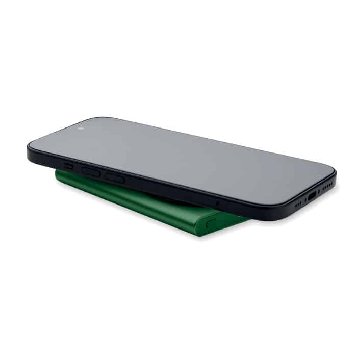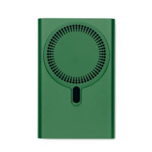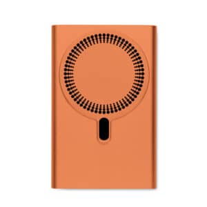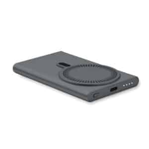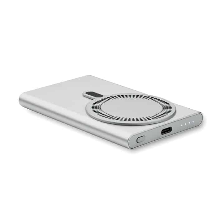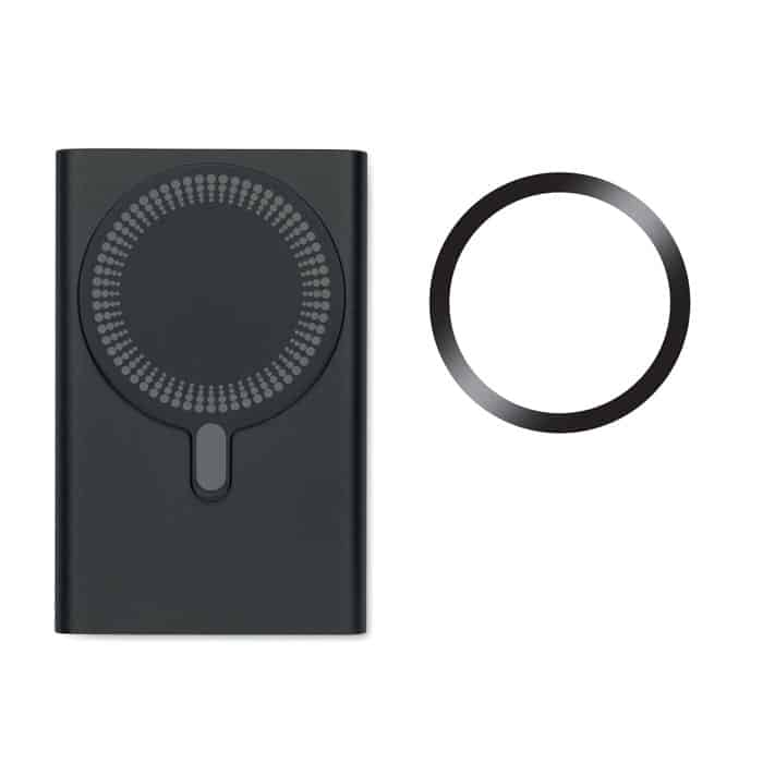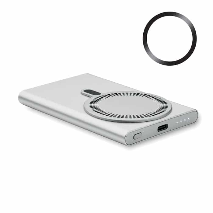 Magnetic wireless powerbank PD 20W. 5000 mAh. Recycled aluminium (GRS). Outputs: USB-C up to 20W. Wireless charging up to 15W. Input: USB-C 18W. 4 LED indicators. USB-C to USB-C cable with USB-A adapter and magnetic ring included.