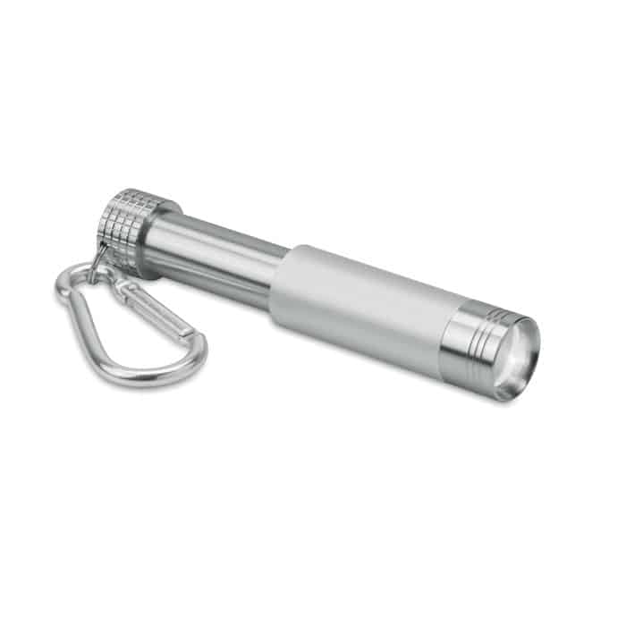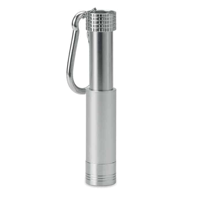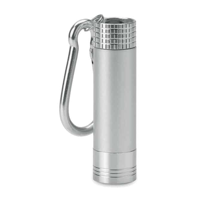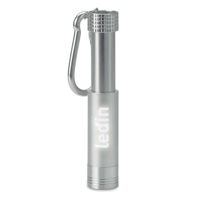 Mini aluminium and ABS LED key ring. The logo can be laser engraved and the light will illuminate the logo. 4 LR44 batteries included.